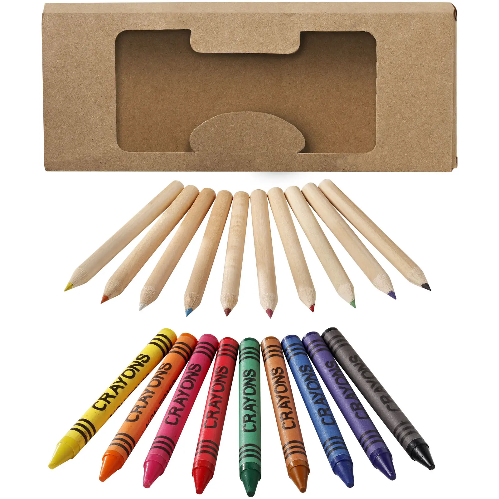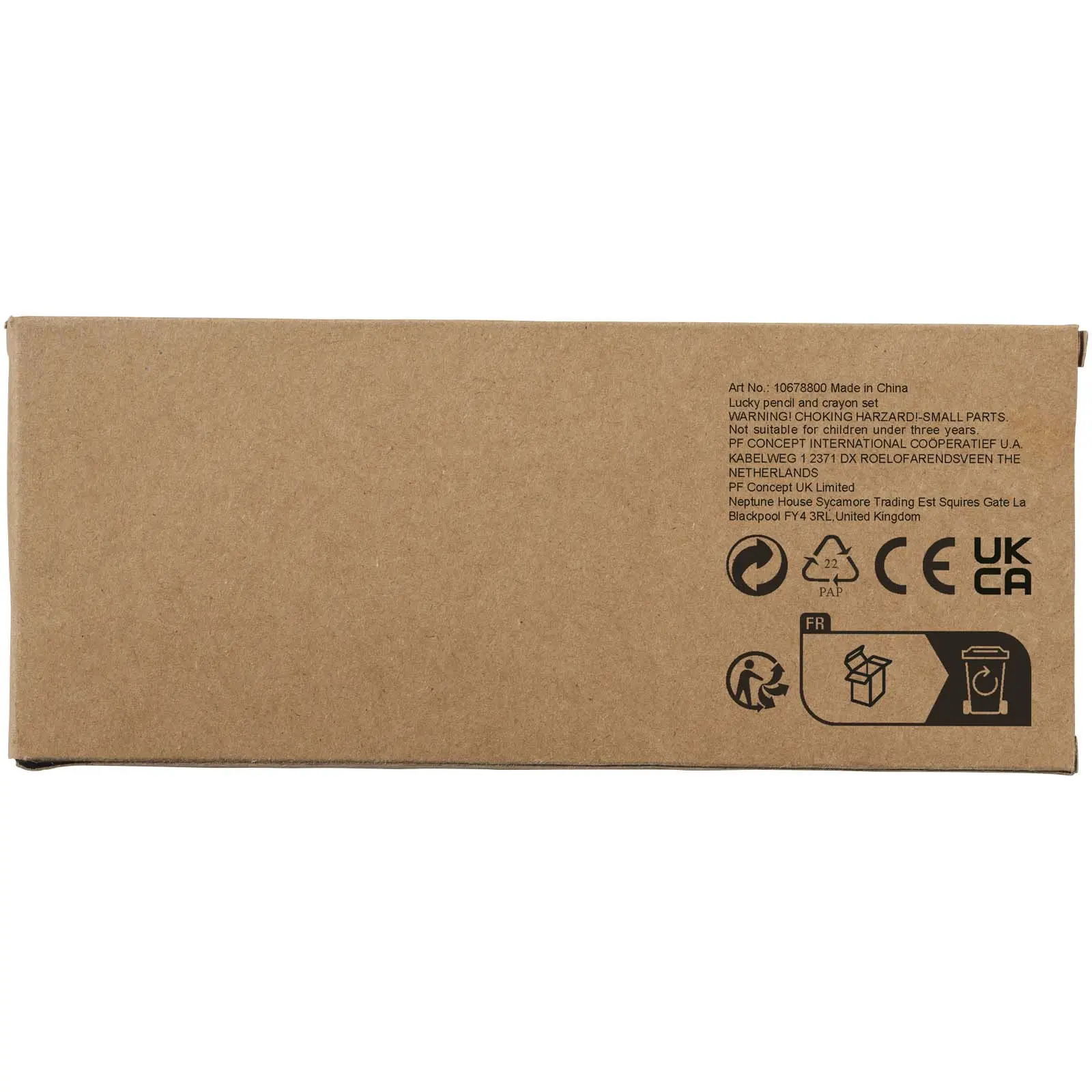 €0.929 coloured wax crayons and 10 coloured pencils in carton box with plastic window. Decoration not available on components.
