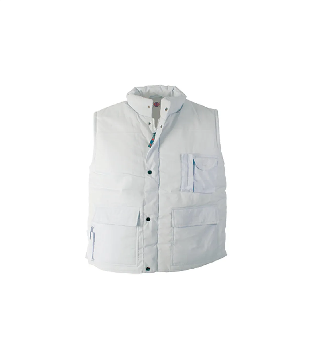 Padded vest with stand up collar and multiple front pockets. 35% cotton and 65% polyester.