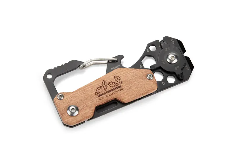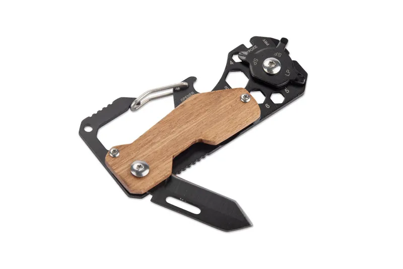 €8.61The FINLI multi-tool with a carabiner is a practical solution for any situation. Made of metal with wooden elements, it combines a ruler, carabiner for attachment to a belt or backpack, bottle opener, knife, flat and Phillips screwdrivers, pry bar, spoke wrench, and hex keys. Additionally, with the prying function, it is an ideal tool for everyday use and maintenance tasks.