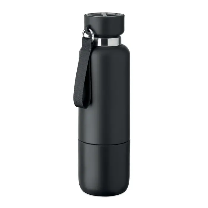 €9.34Double wall insulated bottle in 90% recycled stainless steel and 10% stainless steel, with integrated strap handle and additional long strap (70cm) in PP lid. Leak-free. Bottom cup included. Capacity: 500 ml.