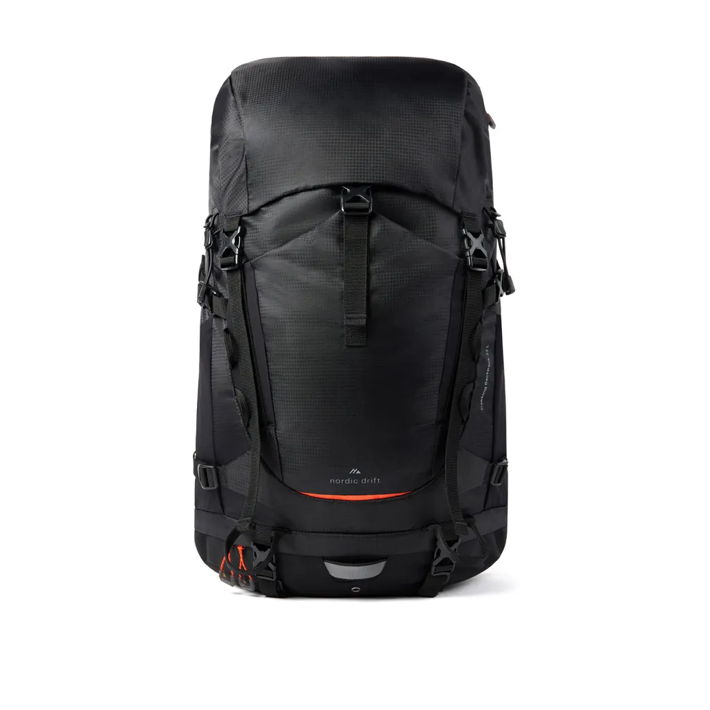The Nordic Drift Trail RCS Backpack 33L offers ultimate durability, comfort, and functionality. Made from RCS-certified recycled polyester, fully PVC-free, with a black finish and orange accents. Lightweight (1175 g), spacious (45×16×60 cm), and ergonomic: adjustable back height, breathable mesh, adjustable shoulder and chest straps, hip belt with pocket, integrated whistle, and reflective stripes. Includes main compartment, internal pockets, water bottle holders, top and front pockets, EU46 ventilated shoe compartment, and rain cover. Perfect for hiking, travel, and everyday use, fully traceable via QR code. Each bag includes a premium FSC®-certified hangtag with detailed information, making it a responsible choice—for you and the planet. All Nordic Drift products are tested for quality. Because we strongly believe in the performance and durability of our gear, every item is backed by a 5-year warranty on manufacturing defects.