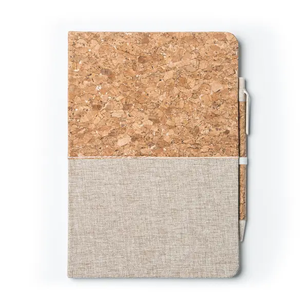 A5 notebook with hard covers in cork and cotton. 80 plain sheets. Cork and wheat fibre pen in matching pen holder included.