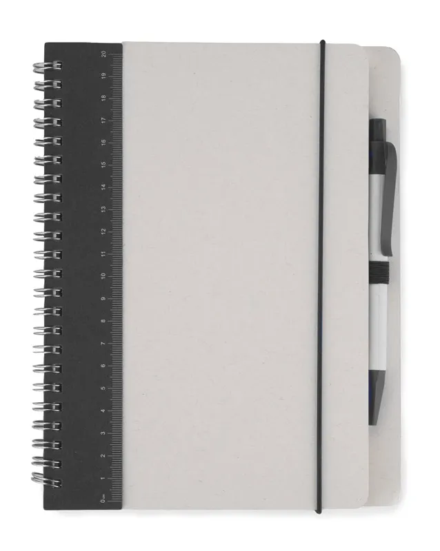 The REGALI notebook and pen are made from milk cartons. The pen has a blue refill. The notepbook comes with a 20 cm long ruler matching the colour of the trims on the pen. The eraser for the pen and the one closing the notebook in the colour of the pen trims.