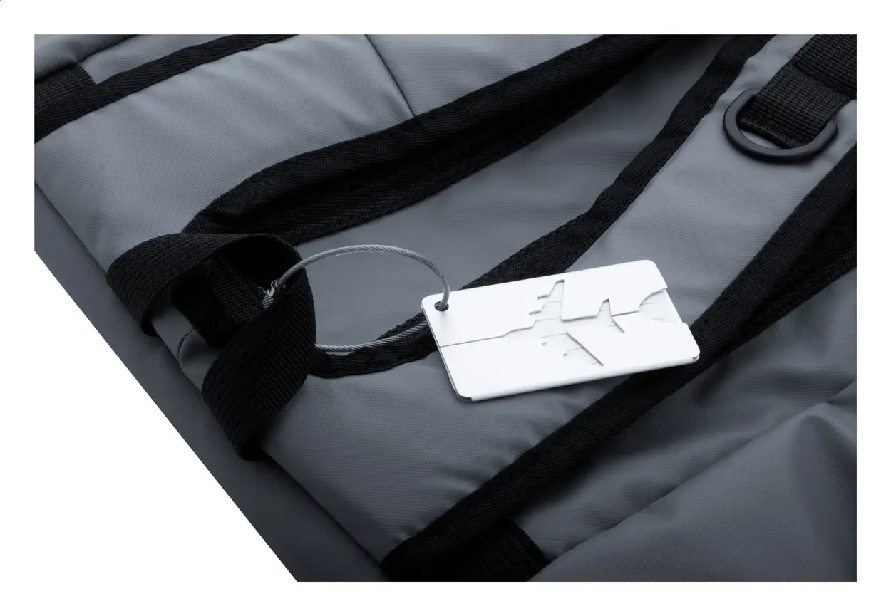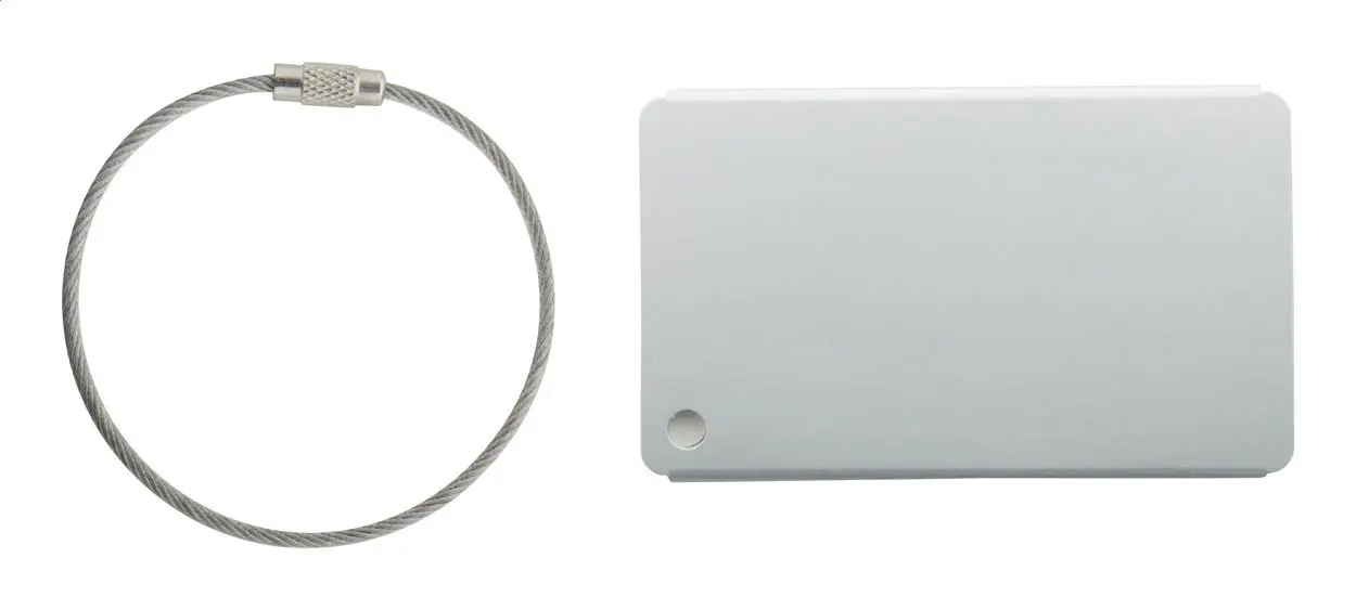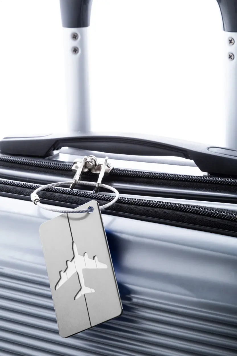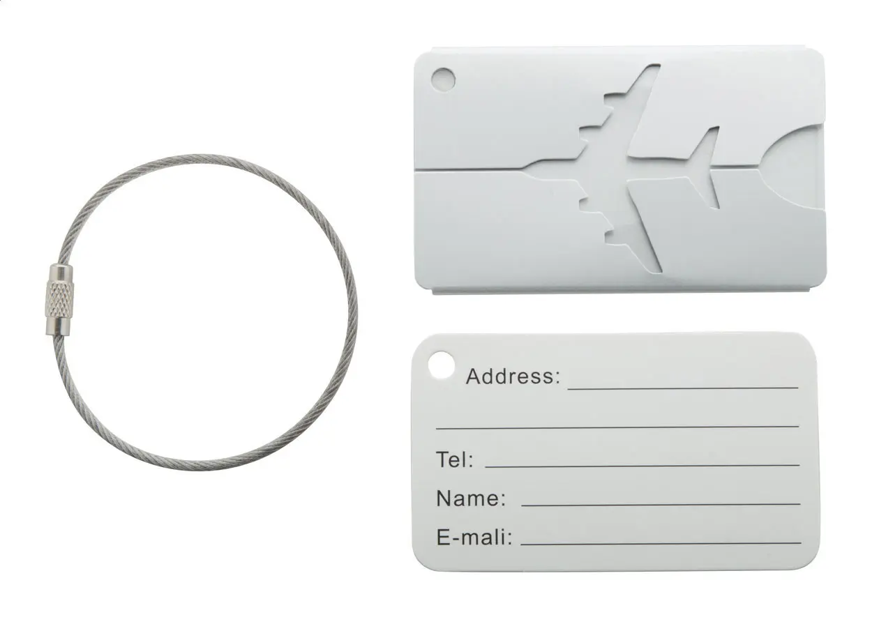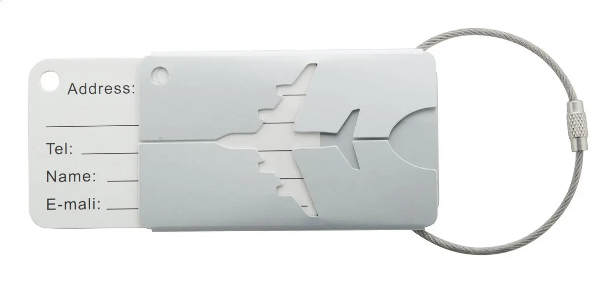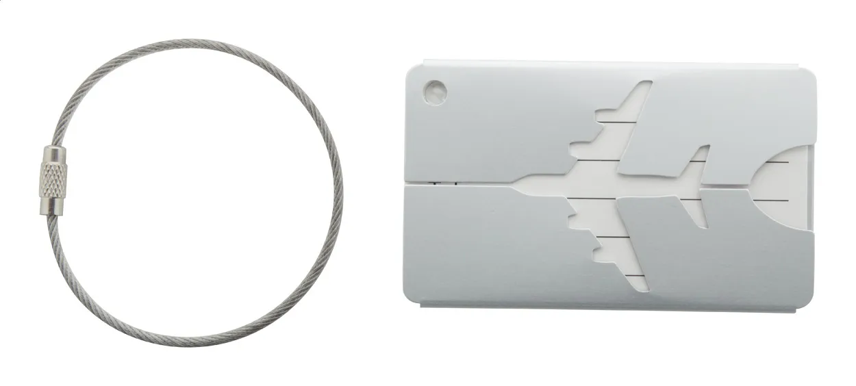 Aluminium luggage tag with airplane motive and metal string.