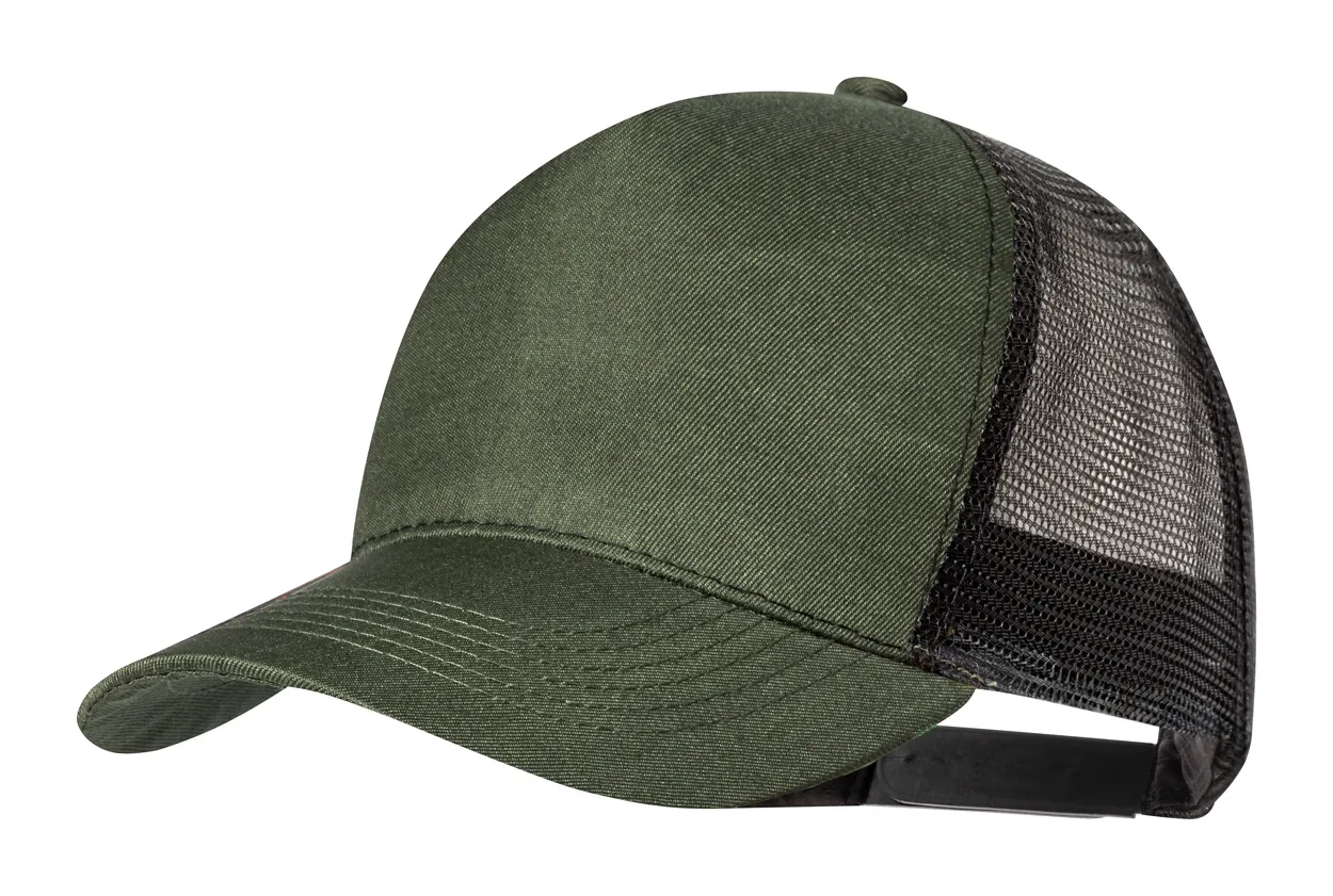 RPET polyester baseball cap with 5 panels and plastic closure.