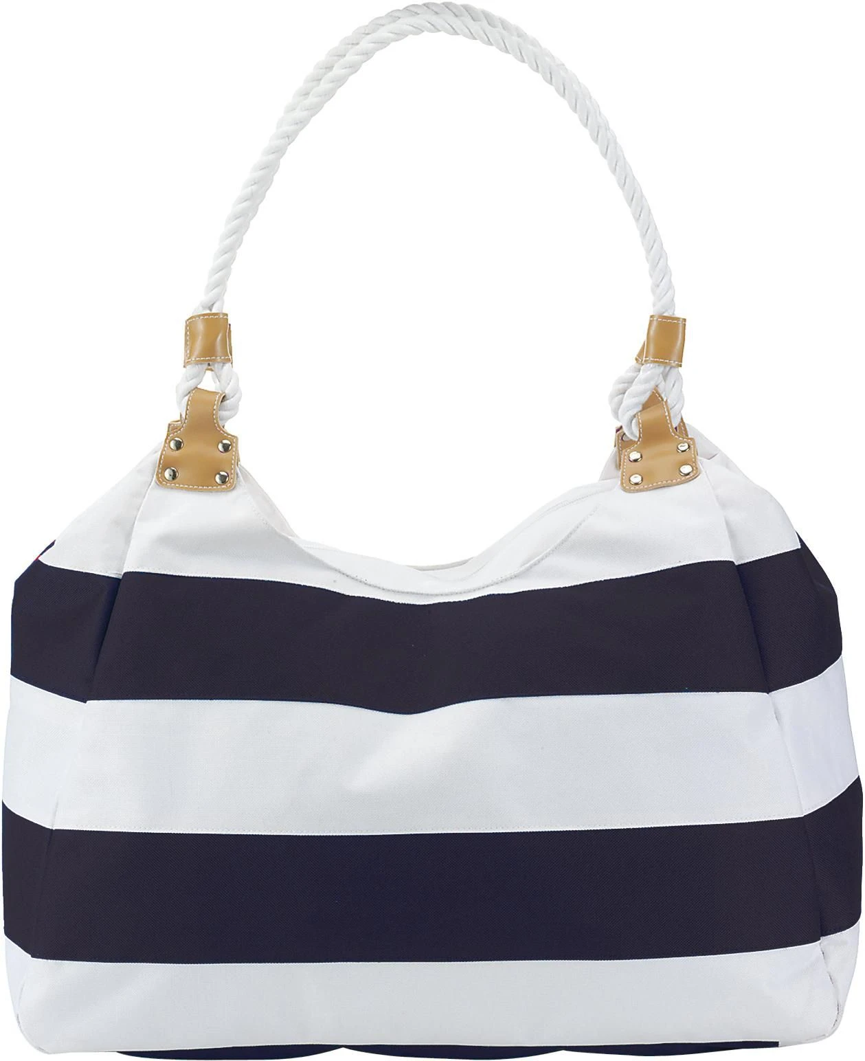 Polyester (600D) beach bag with rope handles and zipper.