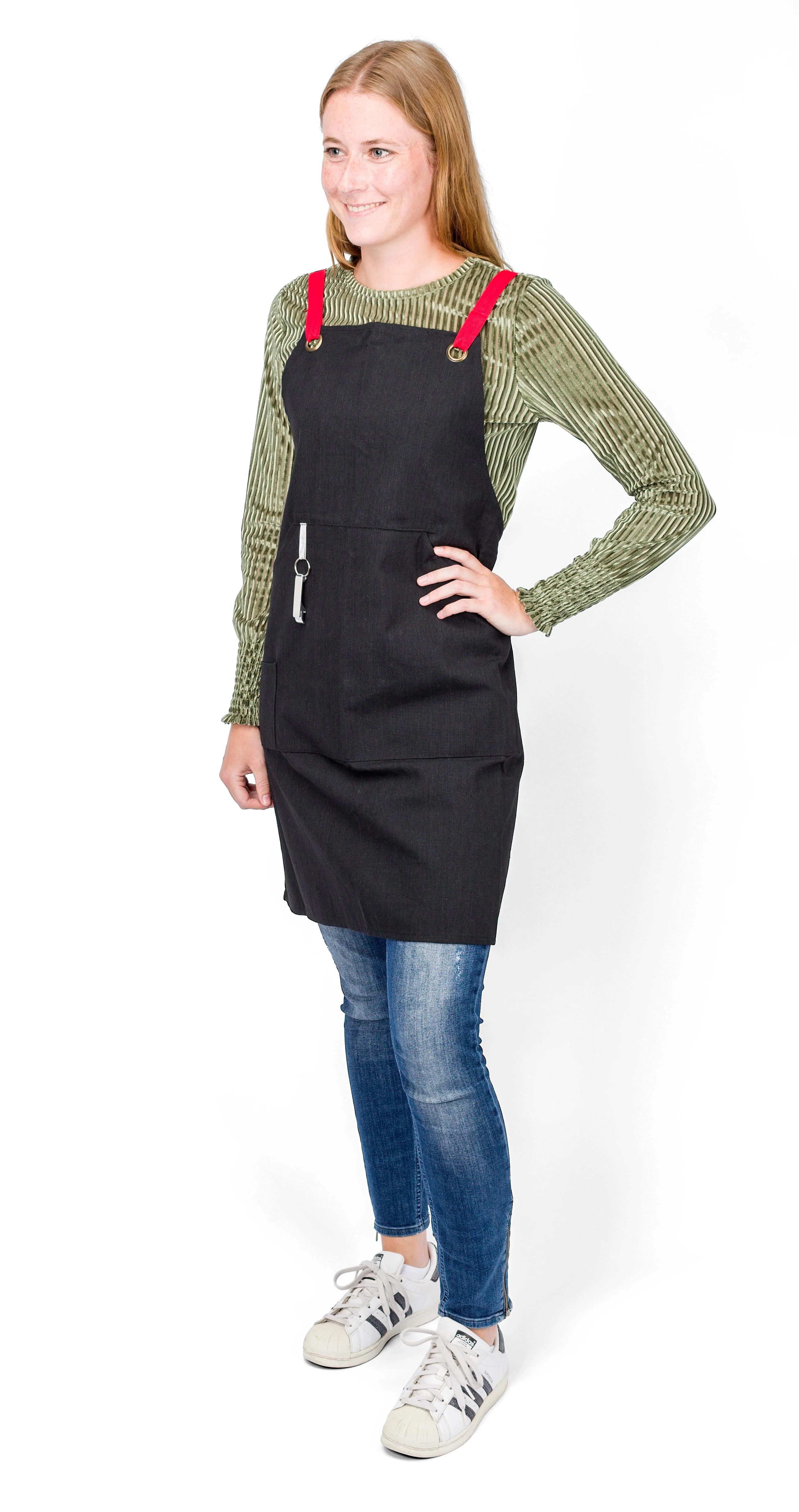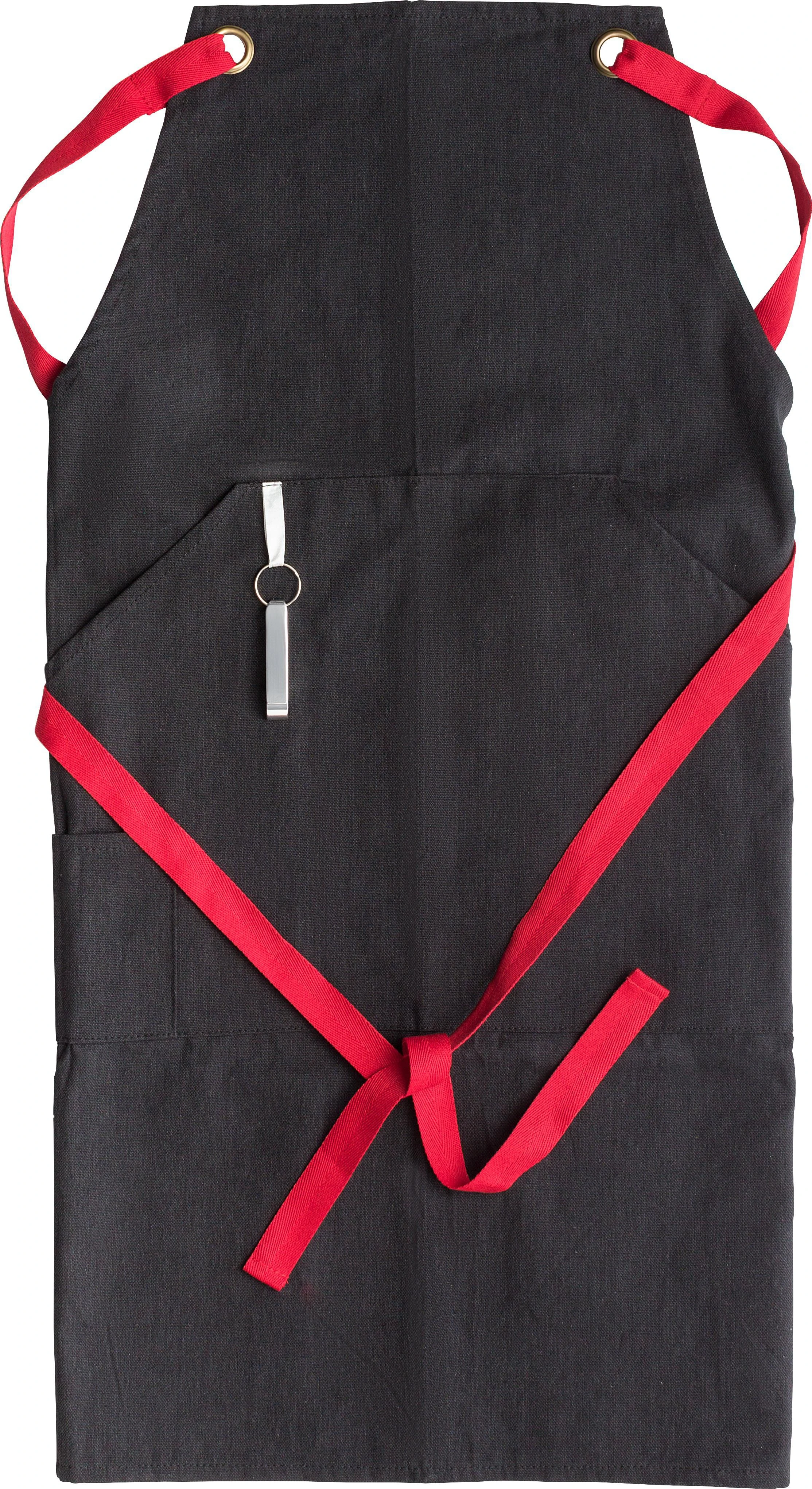 Polyester and cotton apron with colored bands and front pocket. Includes a bottle opener.