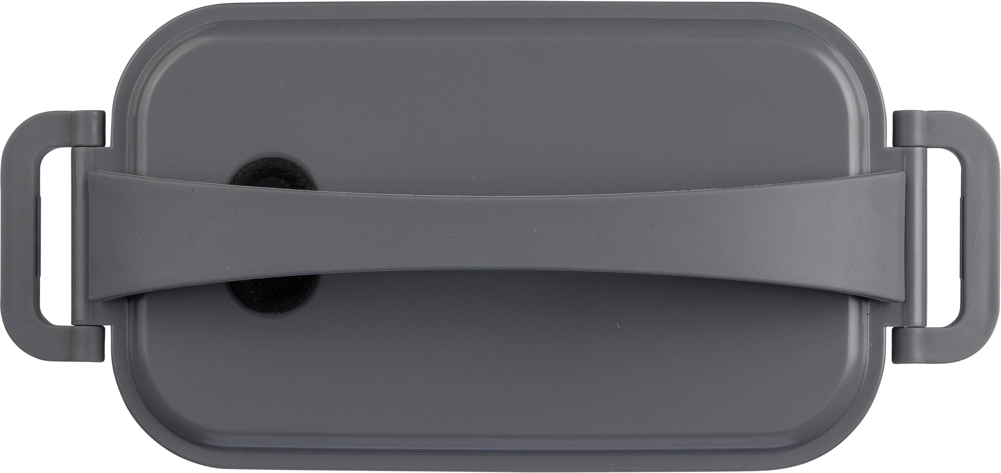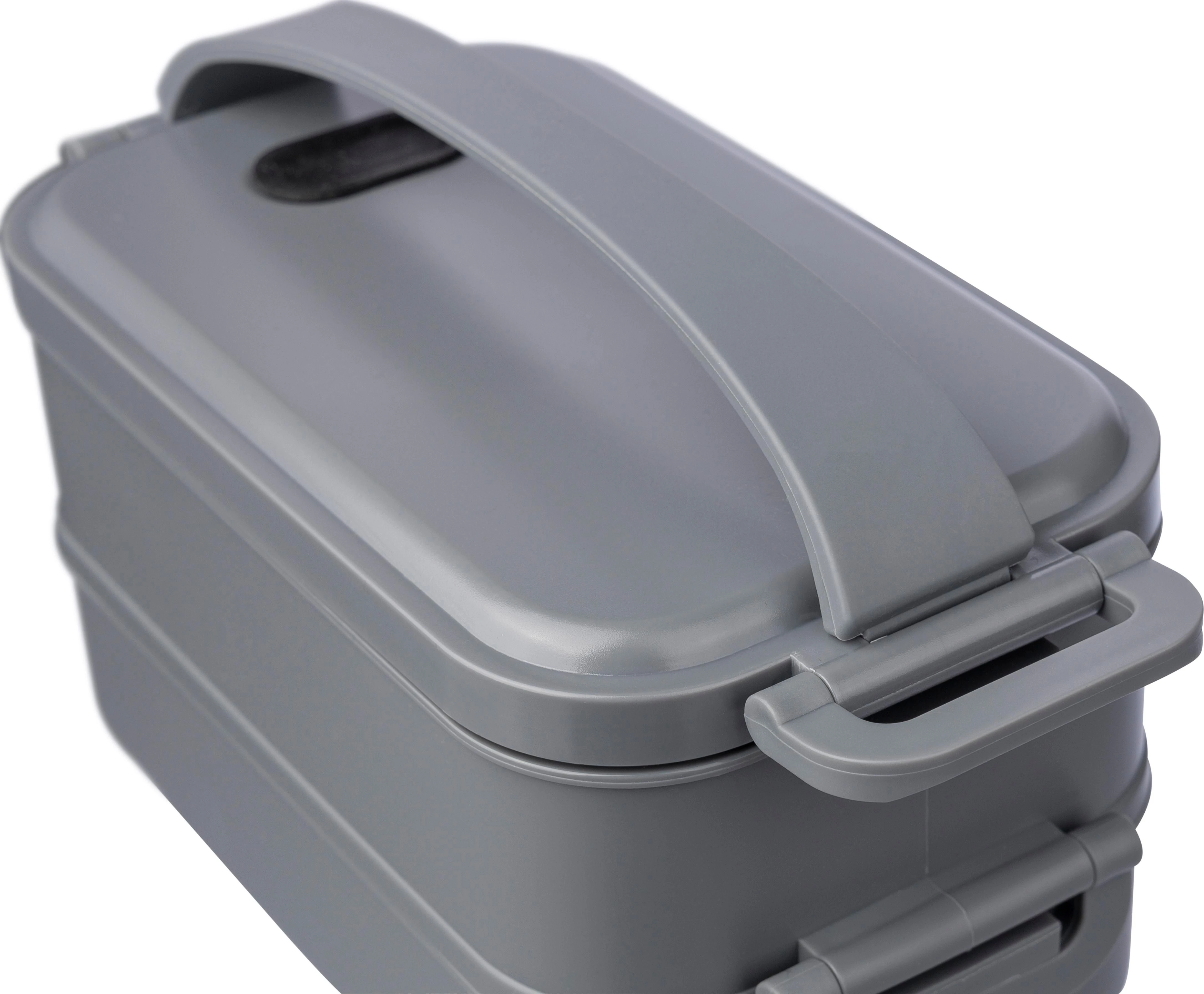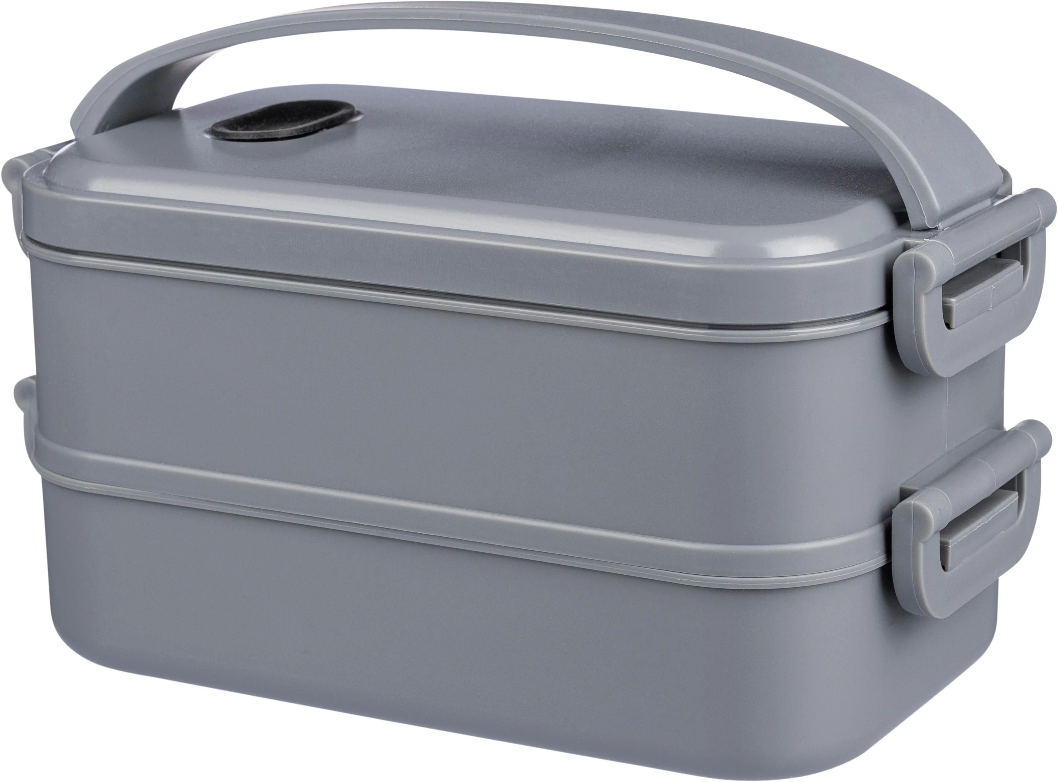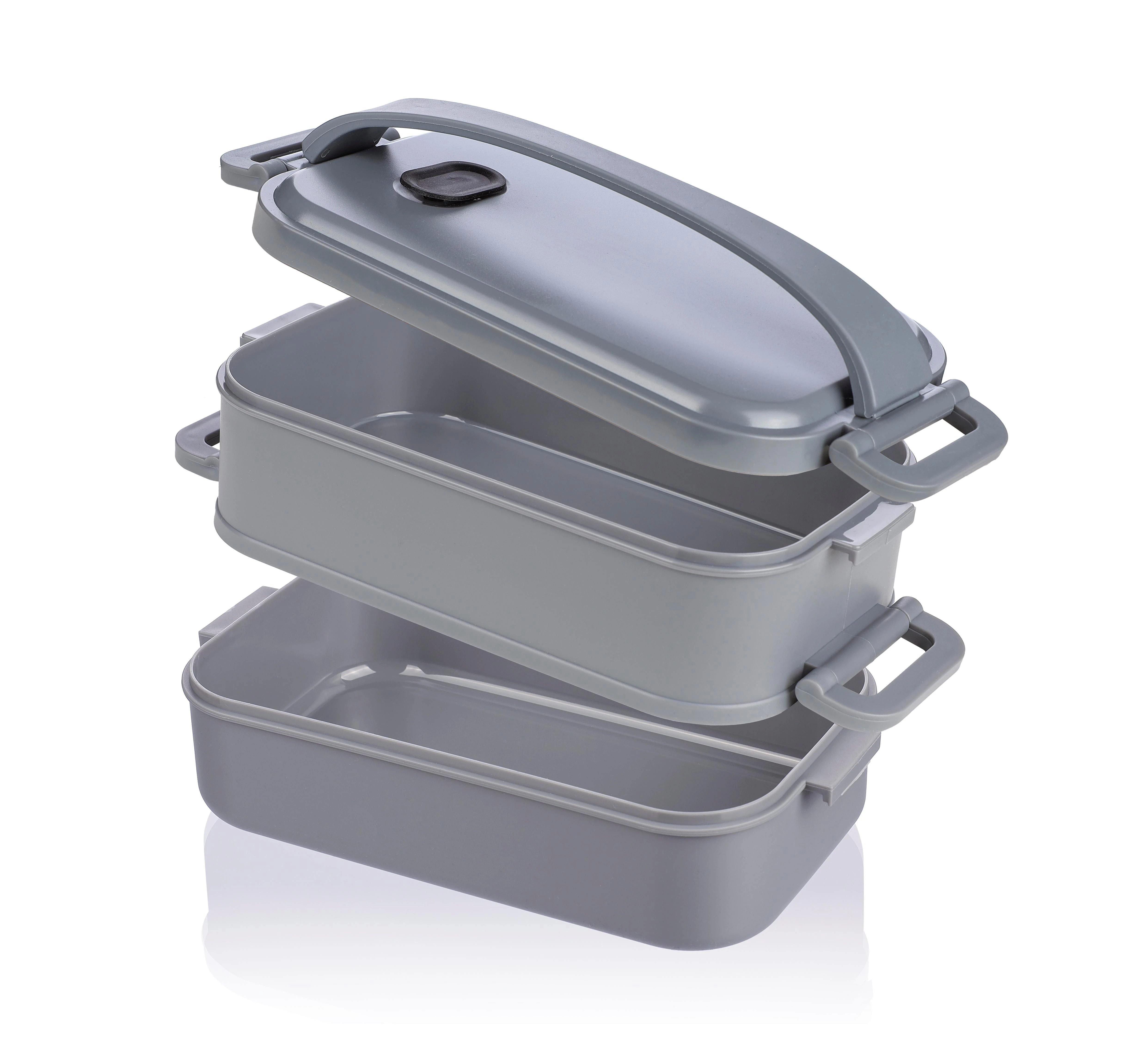 €5.56PP lunchbox with a total capacity of 1600 ml, divided into two 800 ml layers. Features a silicone valve suitable for microwave use, a buckle closure, and a silicone carrying handle. Packaged in bulk.