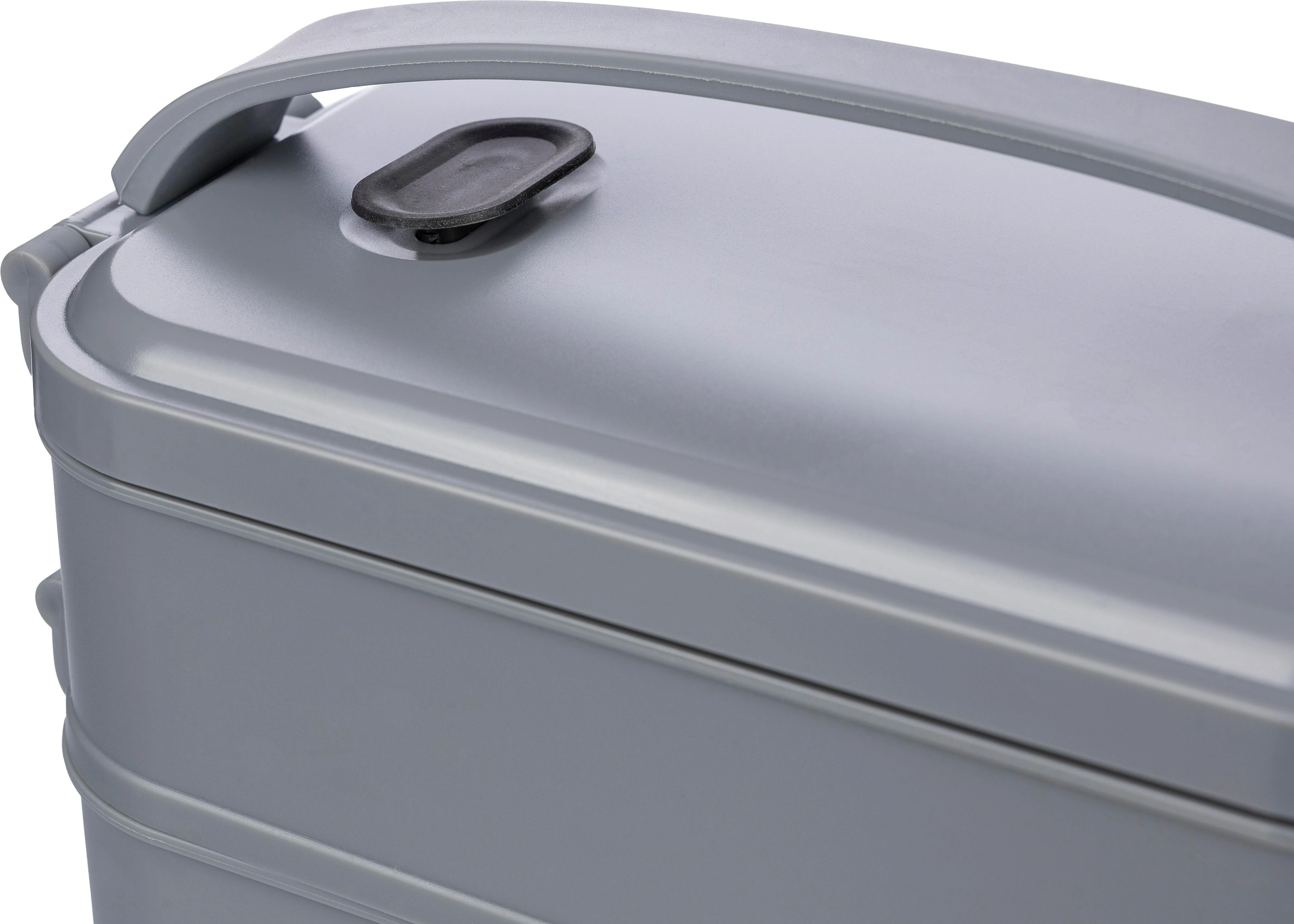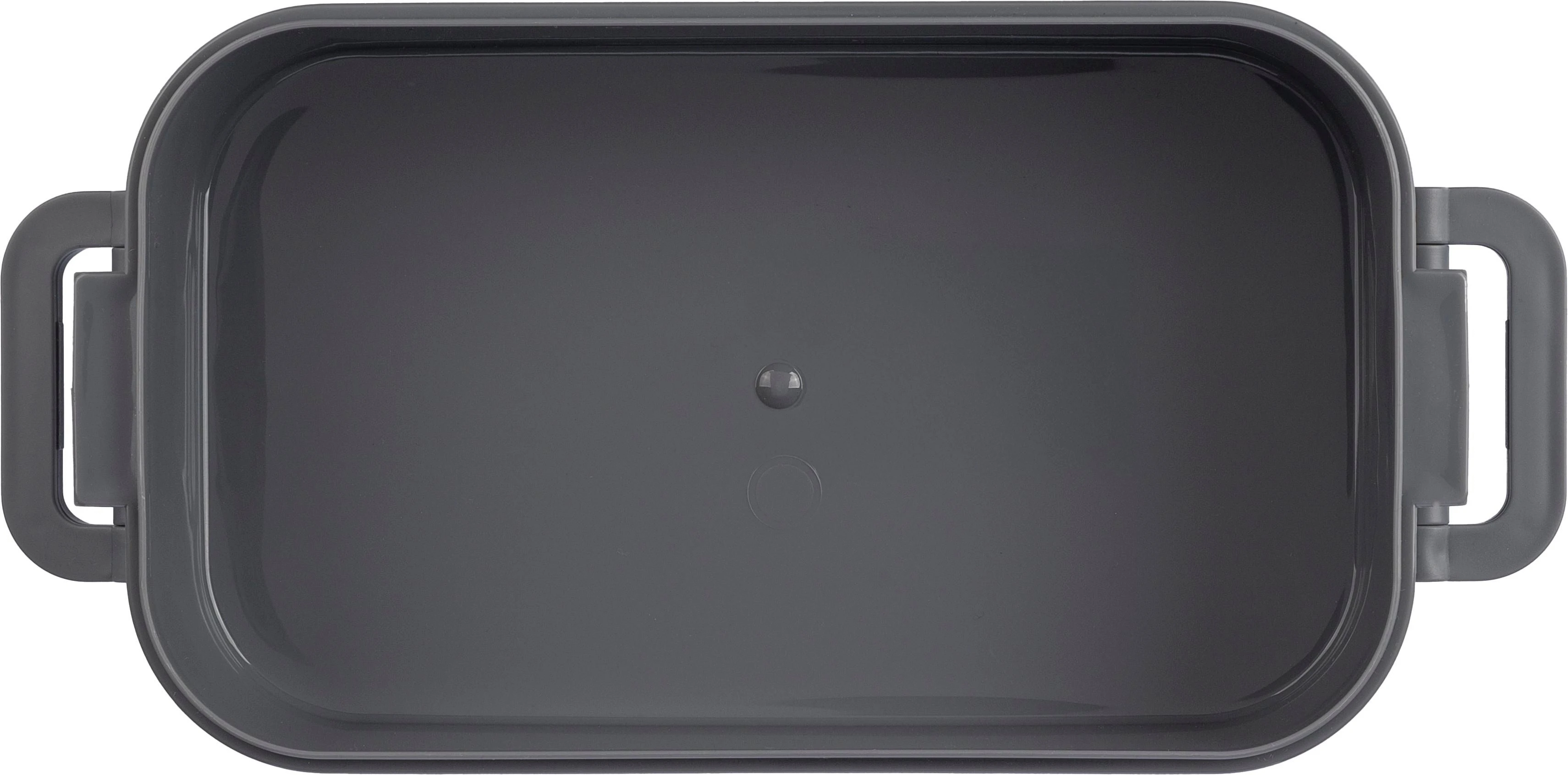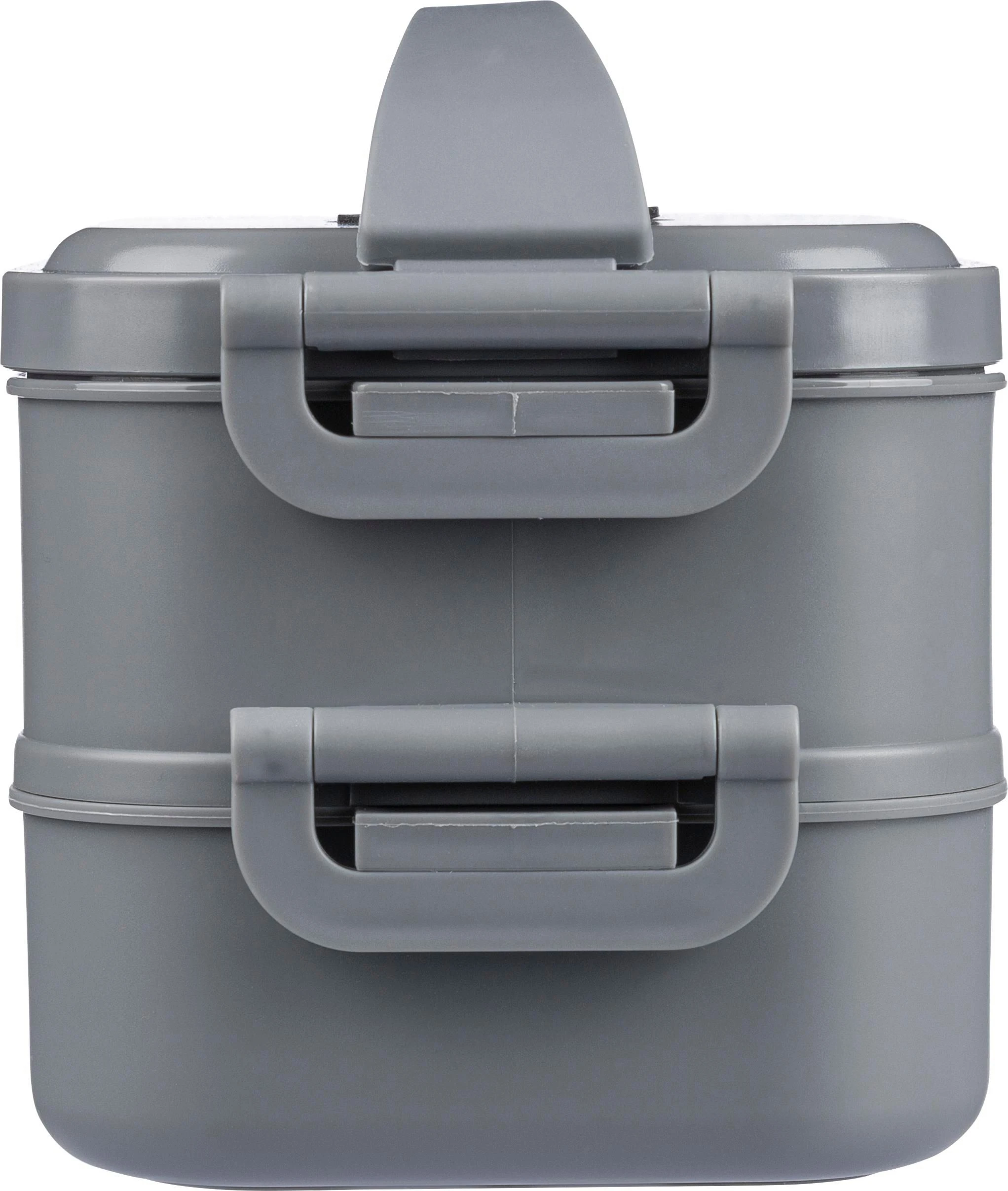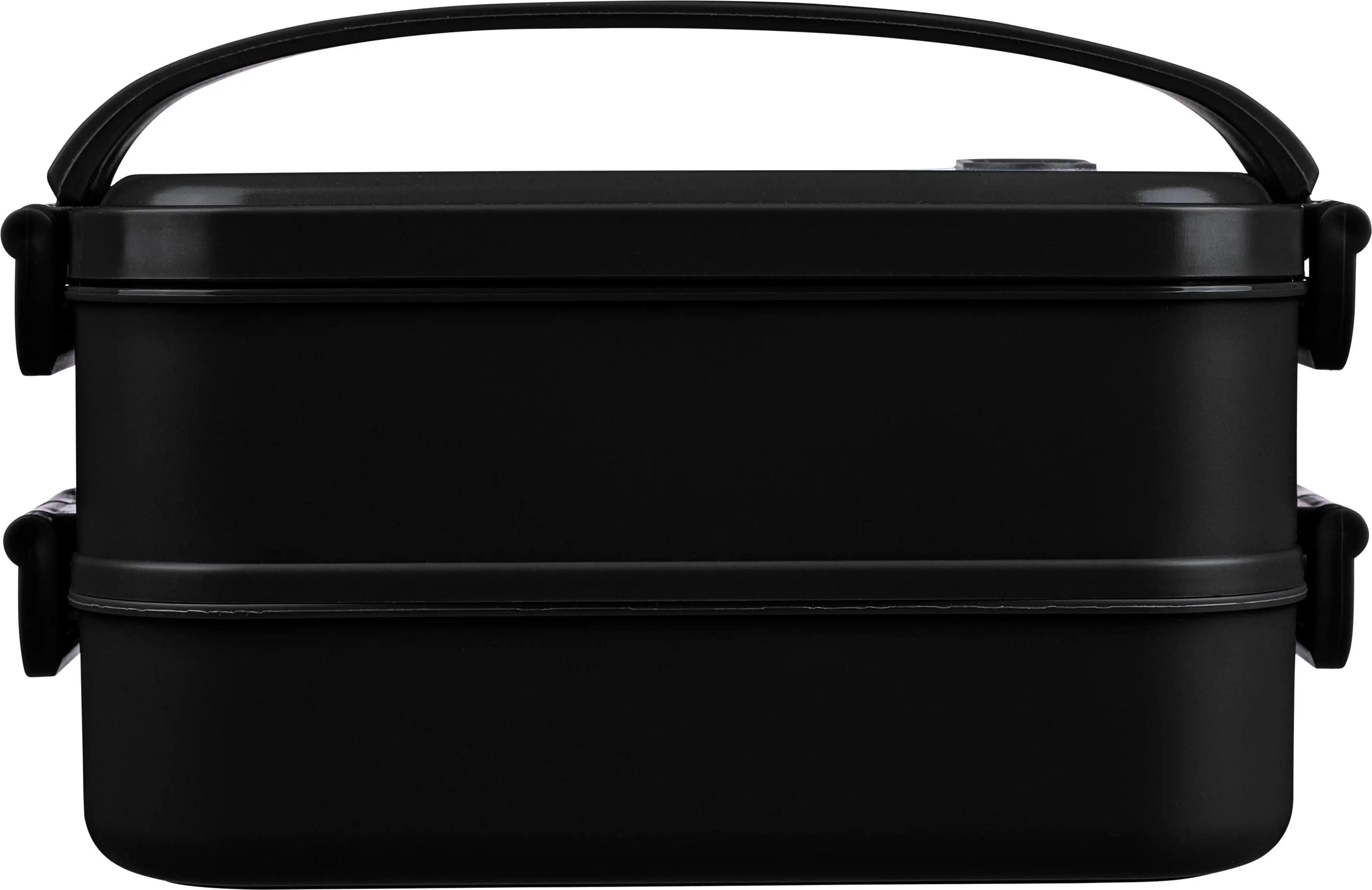 €5.56PP lunchbox with a total capacity of 1600 ml, divided into two 800 ml layers. Features a silicone valve suitable for microwave use, a buckle closure, and a silicone carrying handle. Packaged in bulk.