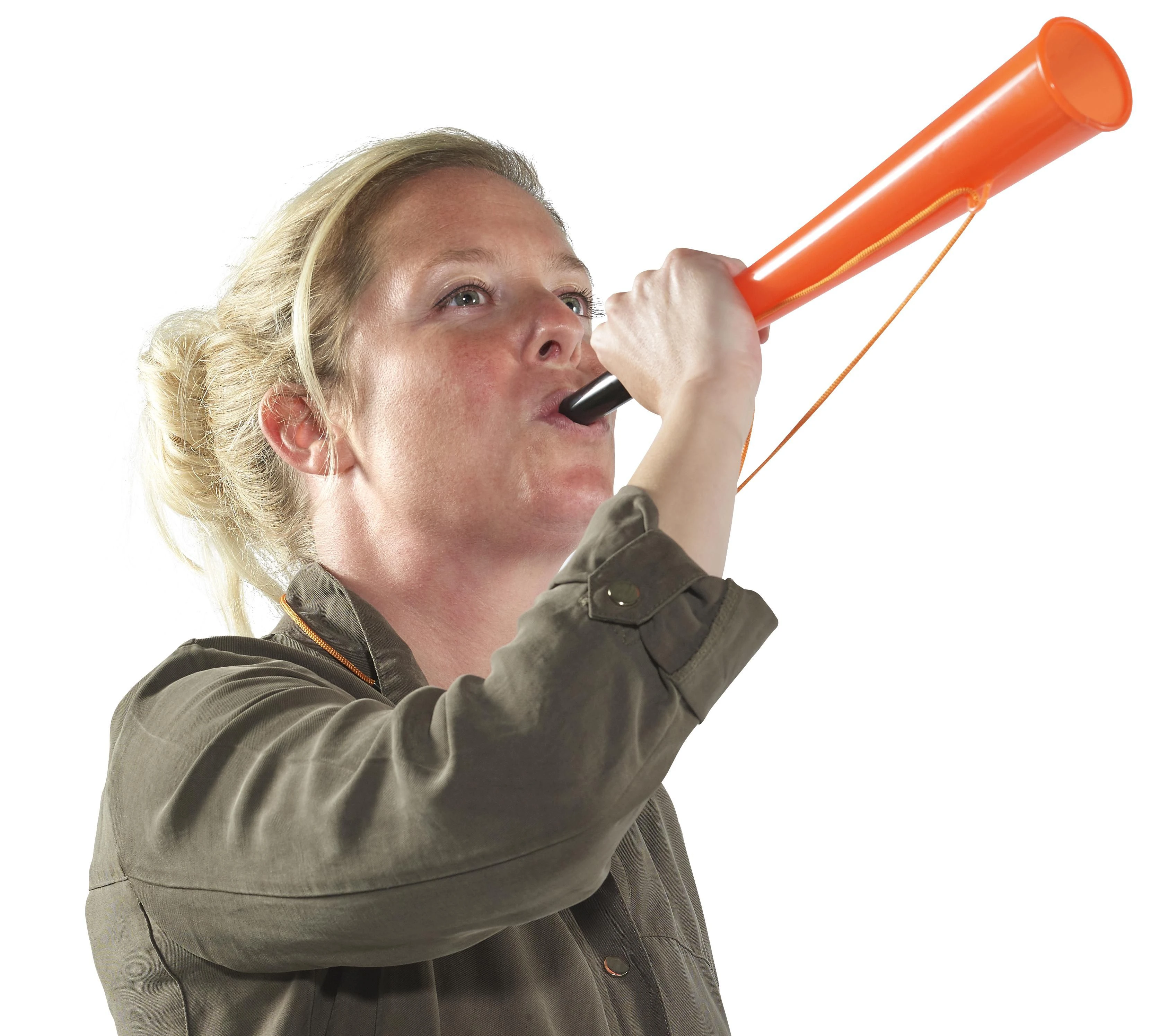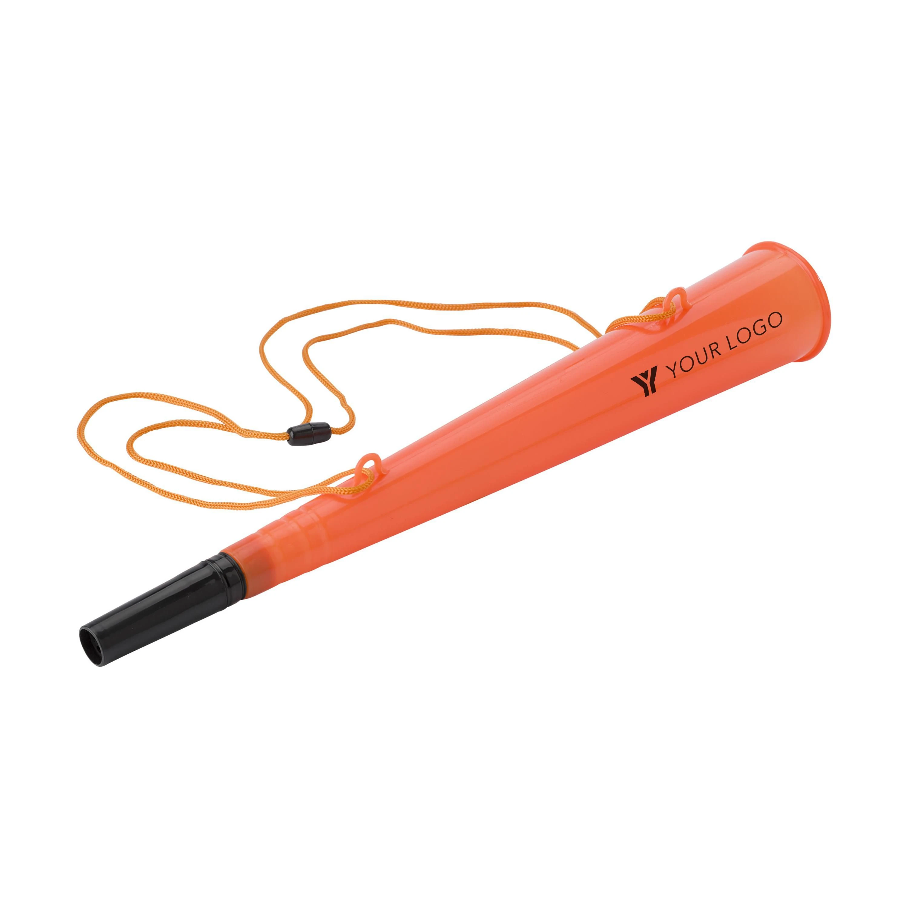 PP stadium horn, including a cord with safety clasp. Cord length: 100 cm.