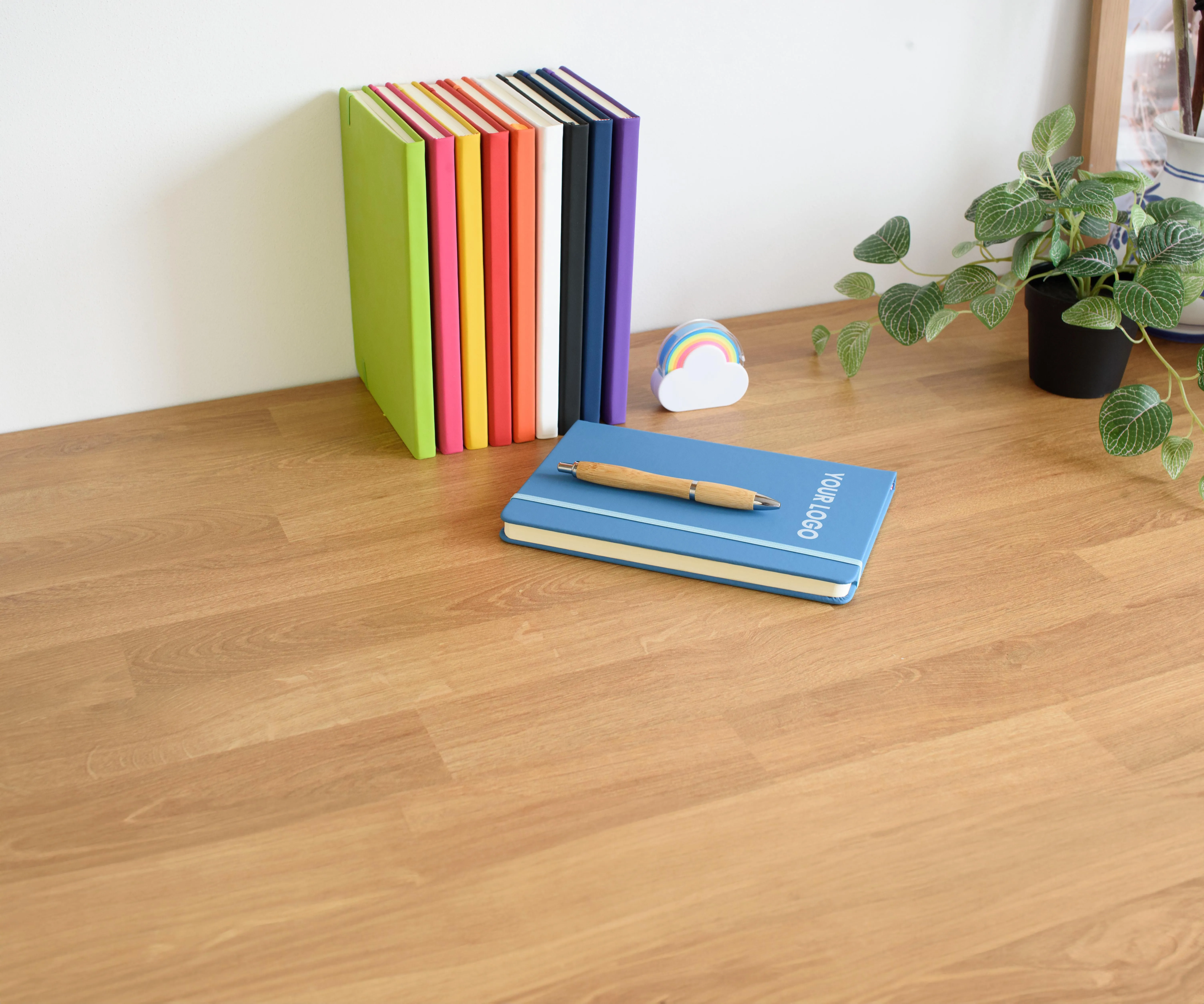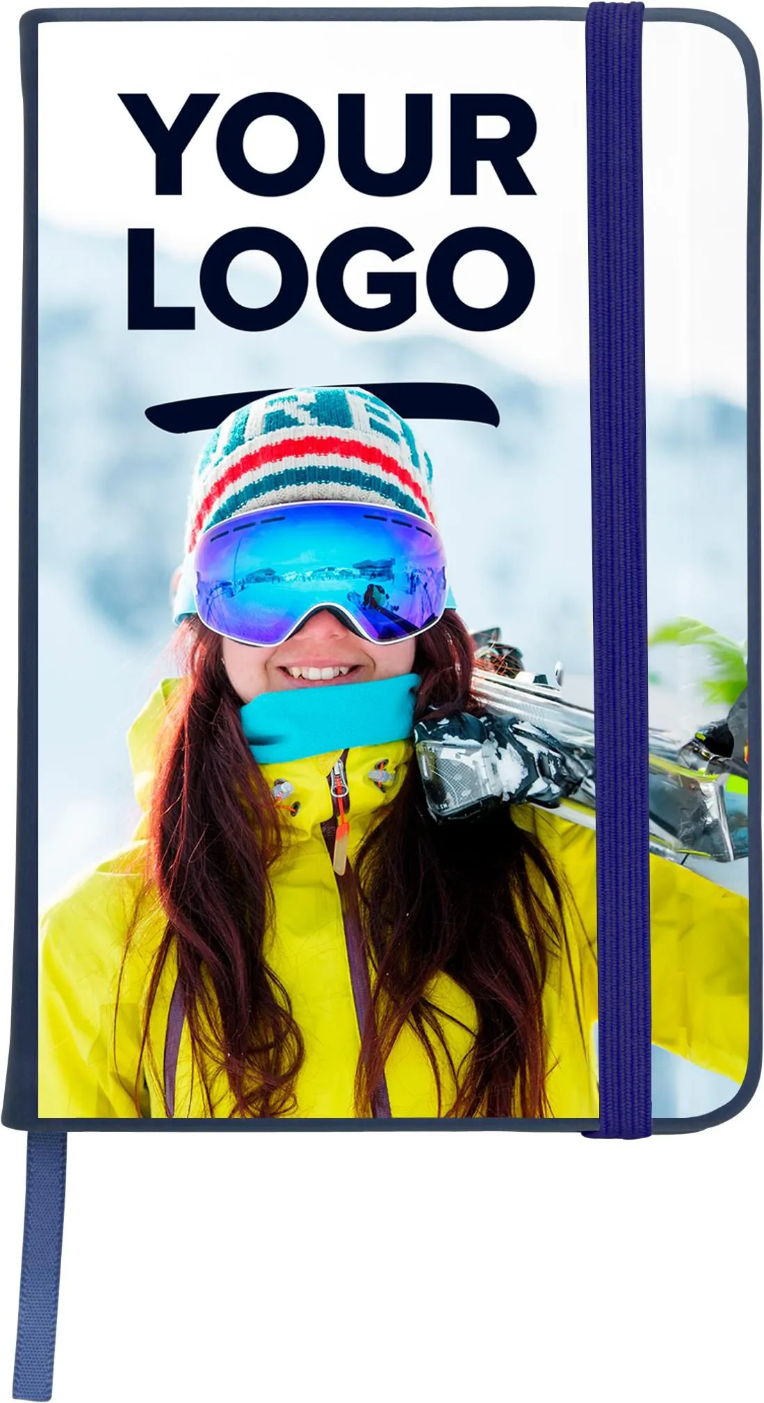Recycled PU notebook (approx. A5), with 96 lined pages, ribbon marker, and elastic band over the cover. The paper in this notebook is FSC® Mix certified. With recycled embossing on the back.