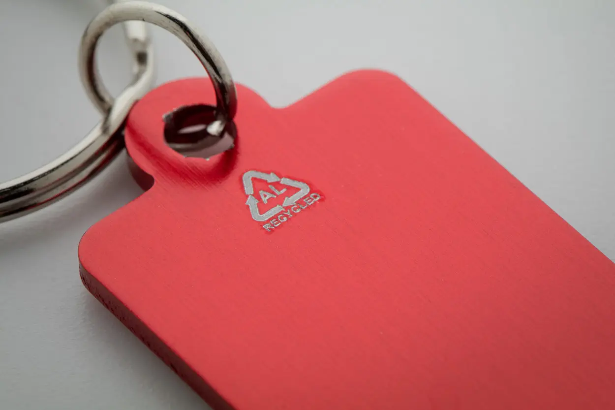 Recycled aluminium keyring with shopping trolley coin.