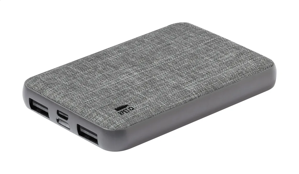 RPET plastic USB power bank with RPET polyester fabric front. With 5000 mAh battery, 2 USB and 1 USB-C charger ports. Micro USB and USB-C input ports. Including USB charger cable.