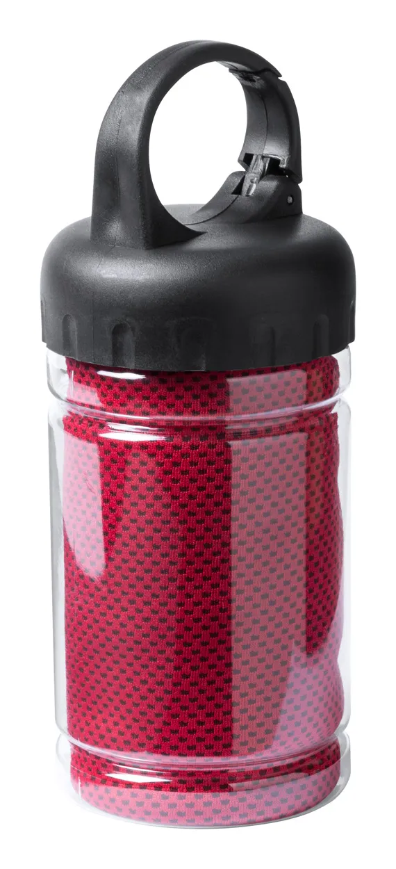 Polyester/nylon sport towel in plastic holder with carabiner, 160 gr/m².