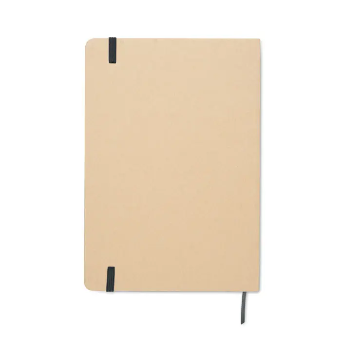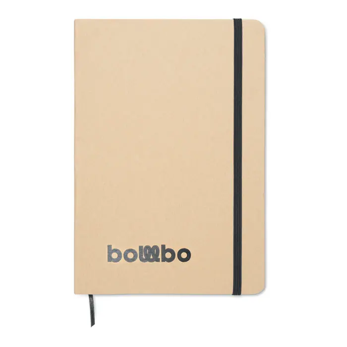 €1.94A5 notebook with hard recycled carton cover. Beige cover. Case bound. 160 lined recycled paper pages (80 sheets). Elastic closure strap, ribbon bookmark matching with revealed colour. After laser engraving the colour is revealed. FSC®-certified | FSC MIX CREDIT, P7.1, FSC-C213206