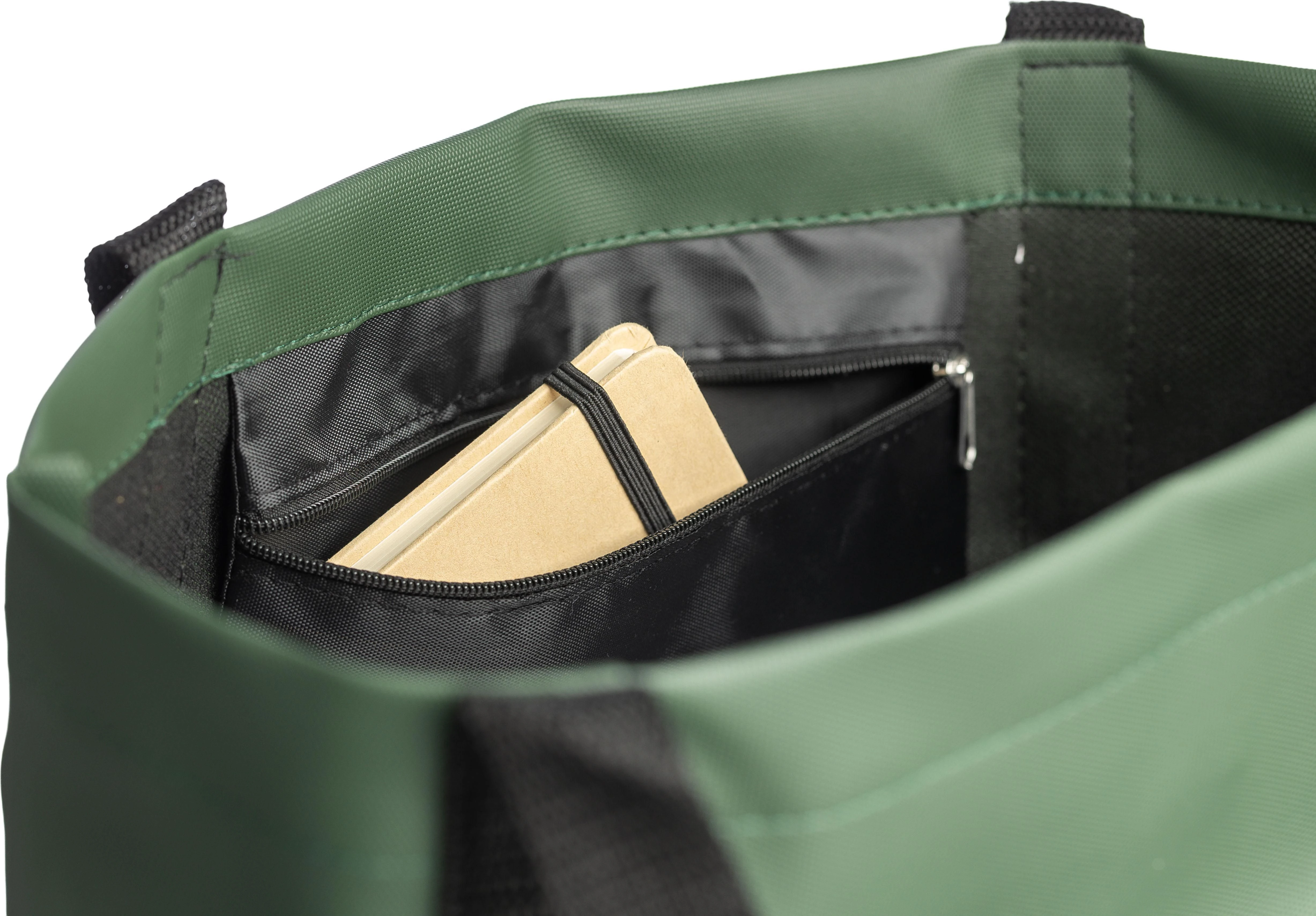 €4.30rPET (600D) polyester tote bag with PU coating on both sides for water repellency. Features a front zippered compartment, a small zippered pocket inside, and long carrying handles. Designed with a 10-litre capacity and a 10 kg carrying capacity. Includes an rPET label.