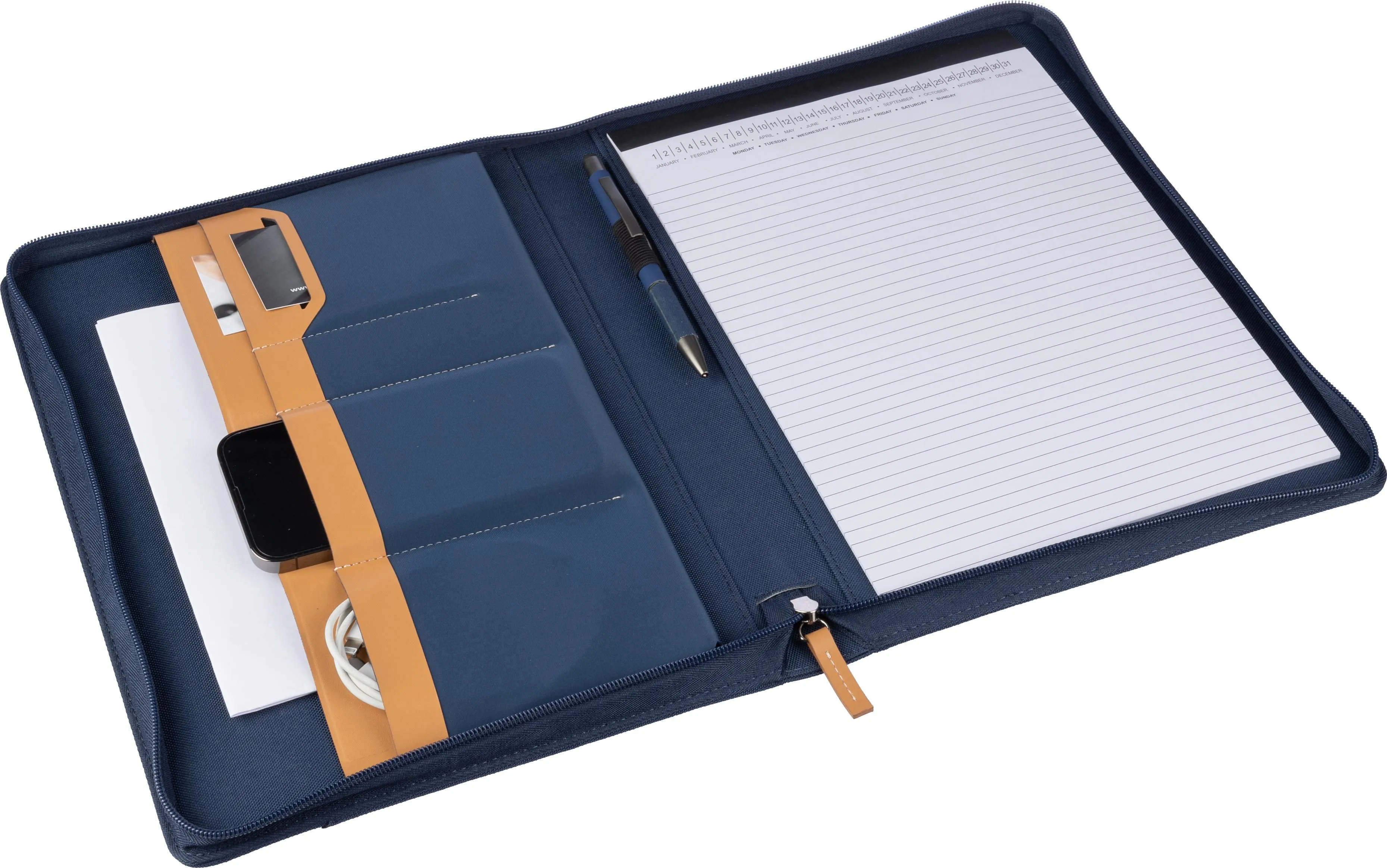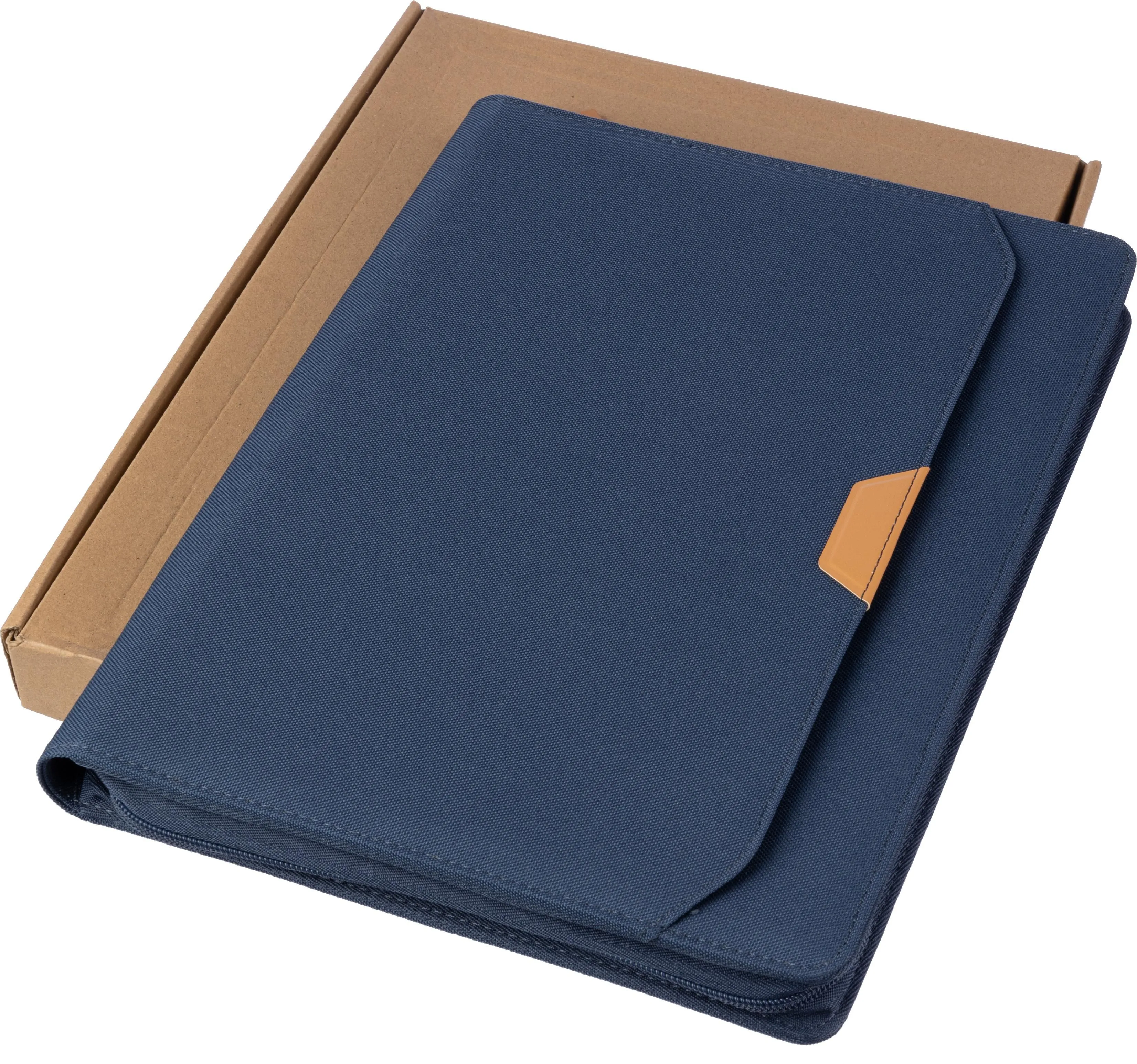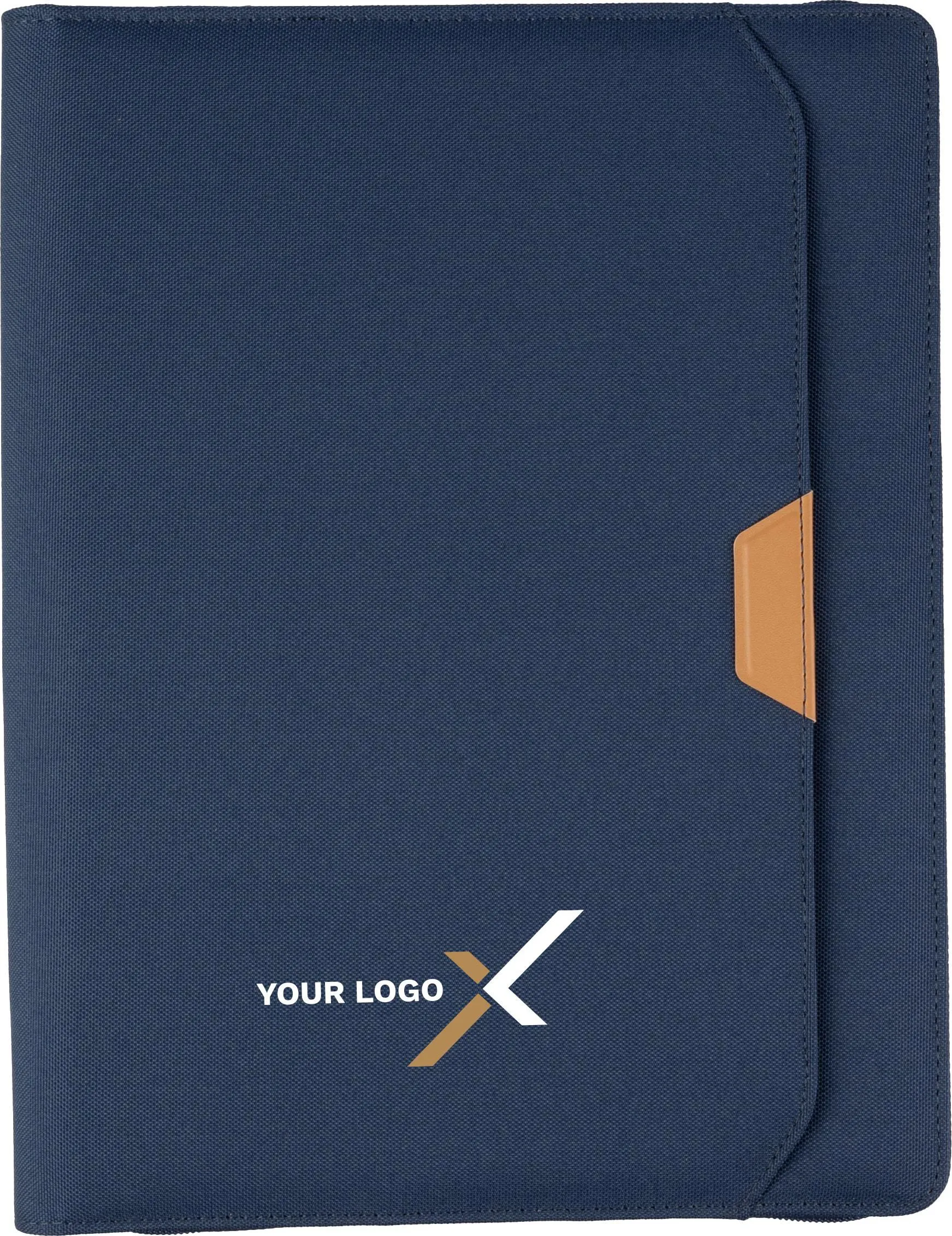 rPET portfolio (approx. A4) with PU detail and zipper. Includes notebook with 20 lined pages (70 gsm), multiple compartments, and a pen loop. The notebook and the paper in this folder are FSC® Mix certified. Small pocket on the front. Individually packaged in a brown kraft box.