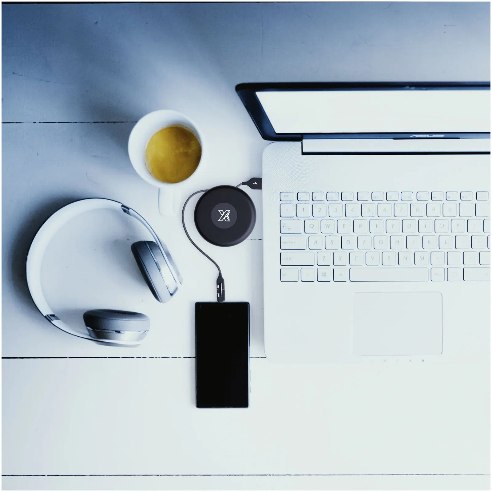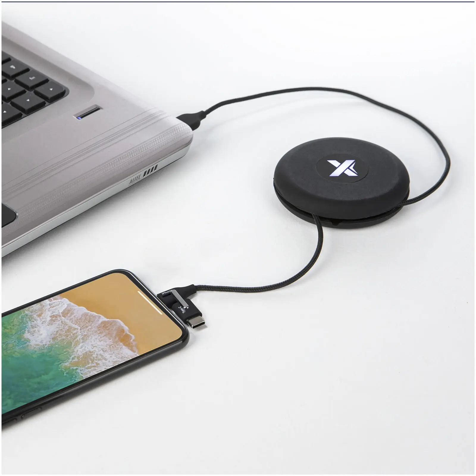 €14.723-in-1 recycled PET light-up logo charging and data transfer cable with reel fitted with three connectors (Type C, Android, iPhone). Compatible with Apple CarPlay and Android Auto. Comes with a silicone storage pouch making it the perfect on-the-go accessory. Packaging is made of recycled paper and recycled plastic.