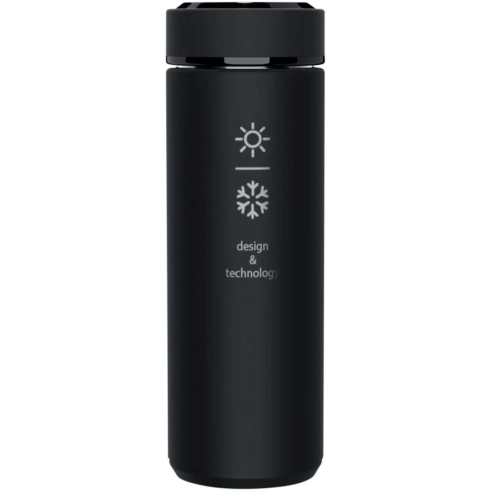 Double-walled 450 ml insulated stainless steel bottle with a temperature sensor. Thanks to the \"Touch & Light\" system, the temperature of the drink is displayed on the bottle cap (in Celsius). Suitable for both hot and cold drinks. Delivered in a cylindrical gift box made of recycled paper. Size: Ø 47 x 225 mm. Battery included: CR 2450 (3V). Battery cannot be replaced. Can display temperature 20.000 times.