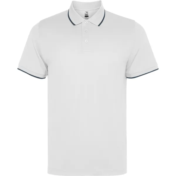 Technical unisex short-sleeved polo shirt. · 1x1 rib on collar and sleeves with contrasting colour detail. · 3-button placket.· Taped neckline in matching fabric.