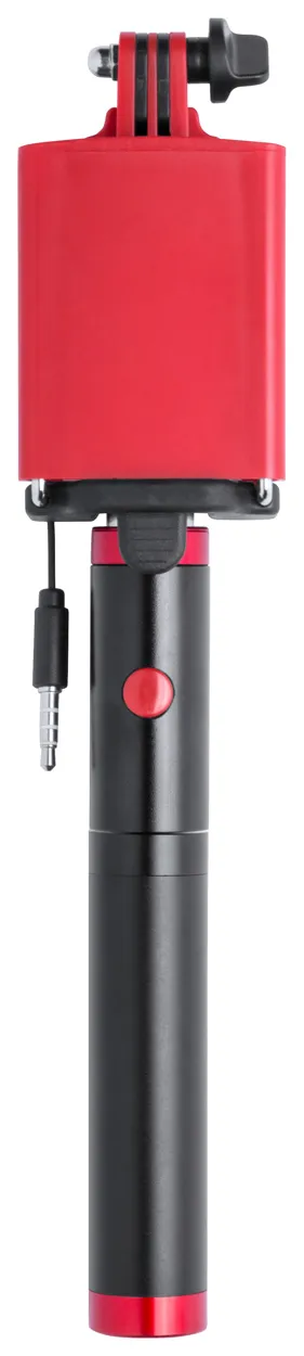 Aluminium selfie stick with camera shutter button (3,5 mm Jack connection) and universal mobile holder. With detachable 2200 mAh power bank in the handle. Including USB charger cable.