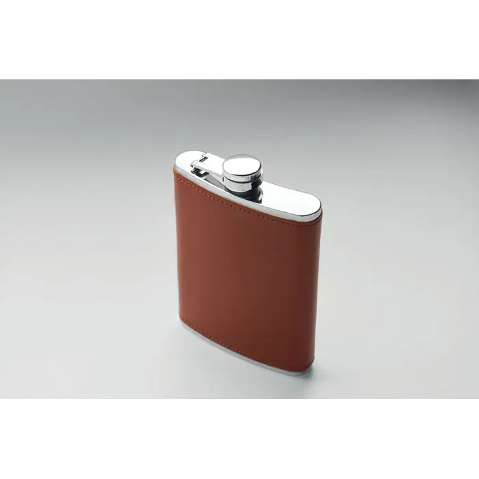 Slim hip flask in stainless steel with PU-leather cover. 200 ml capacity.