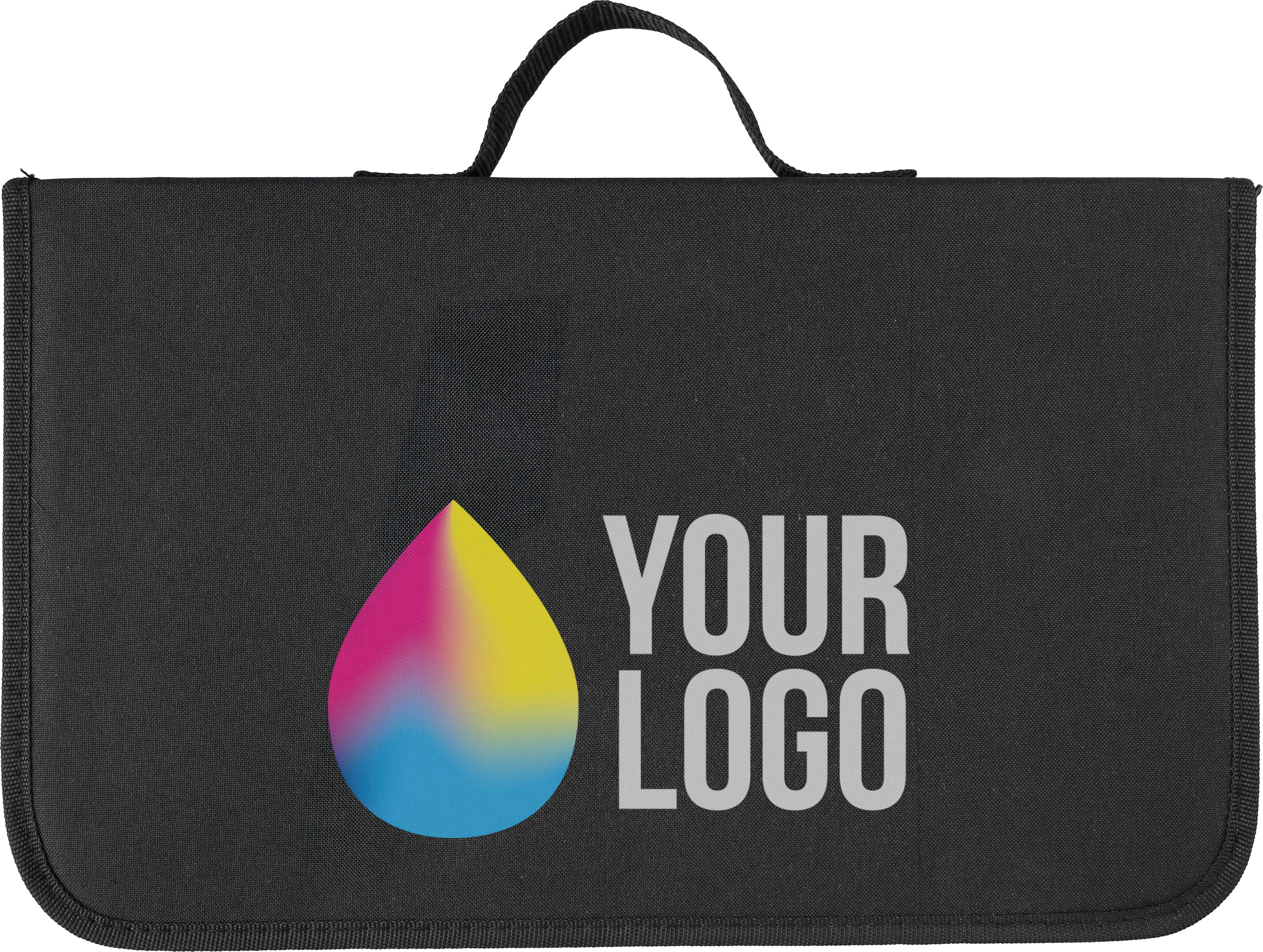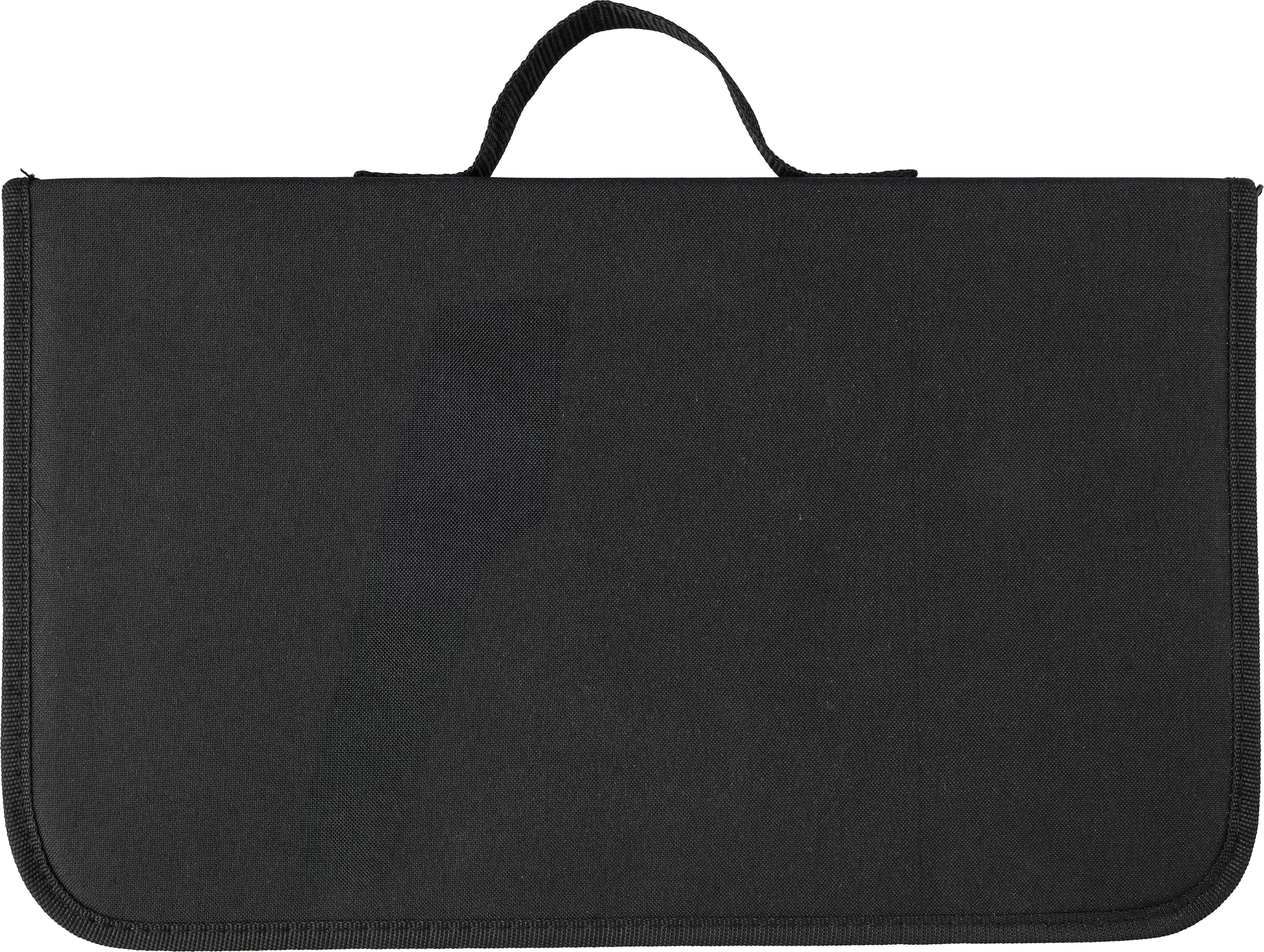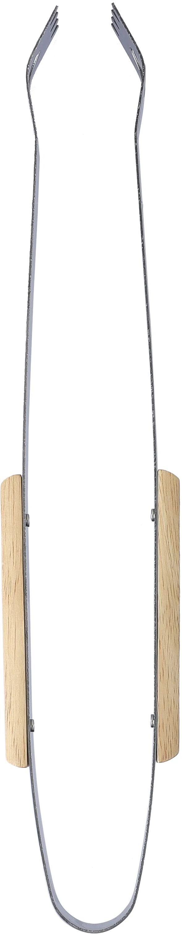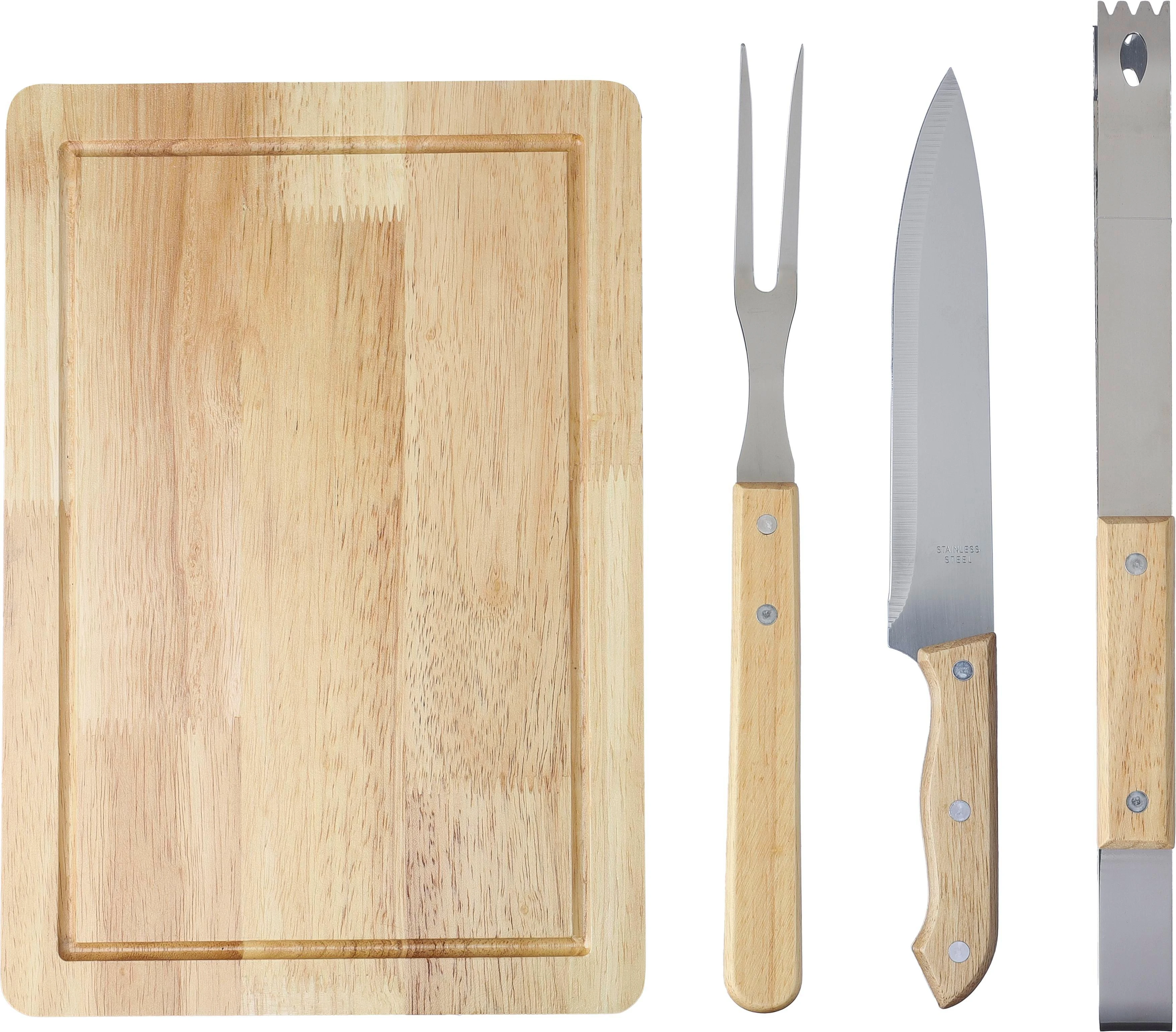 €12.41Stainless steel barbecue set with wooden handles. Tools include a knife, fork, tongs, and a wooden cutting board. Packaged in a 300D polyester zippered pouch with a front pocket.