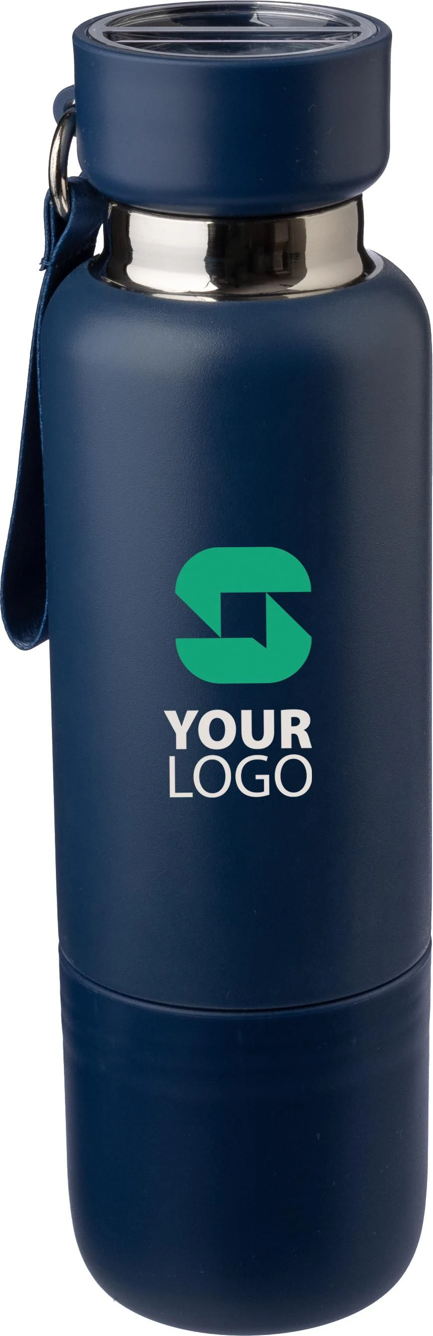 €9.09Stainless steel vacuum double-walled drinking bottle (500 ml) with a PP drinking cup (300 ml) on the bottom. The inside is stainless steel 304, the outside stainless steel 201. PP lid with AS transparent closing, featuring a polyester wrist cord and carrying strap. Matte colors. Individually packaged in a brown carton box.