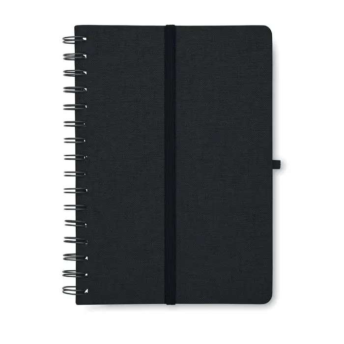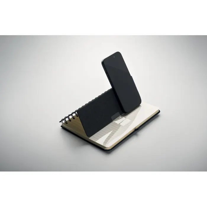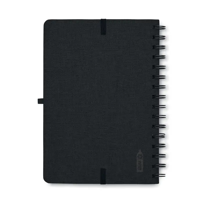 €2.09A5 notebook with 600D RPET hard cover with smartphone stand function. Twin-wire. 160 lined pages (80 sheets). 70 gsm recycled paper. Elastic closure strap.