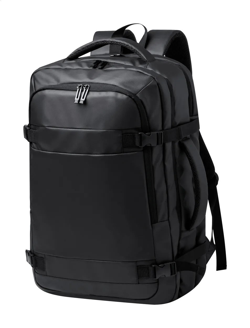 PU leather backpack with zipped compartments, padded laptop (17") and mesh compartment, trolley strap, padded back and shoulder straps.