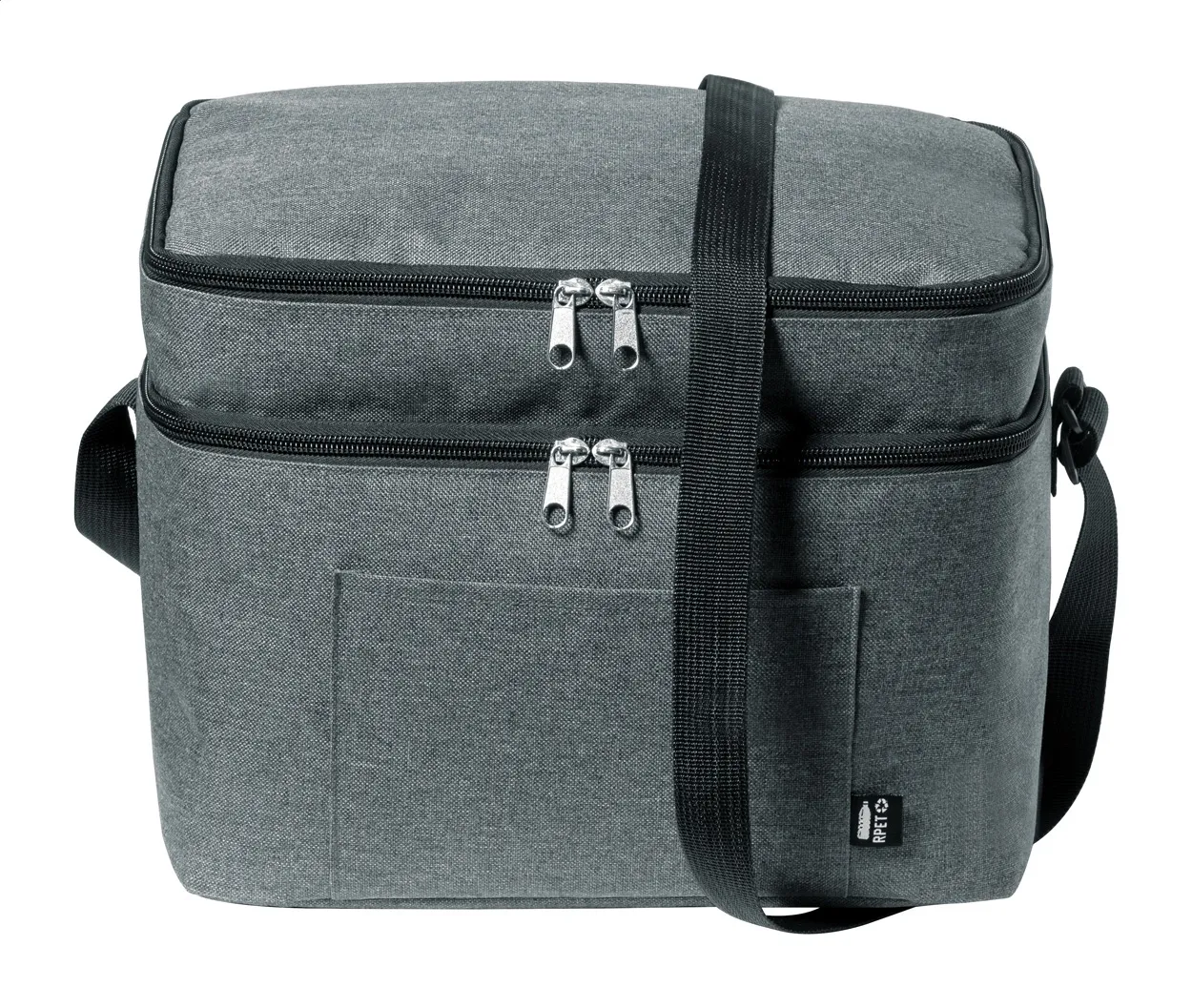 €12.77600D RPET polyester cooler bag with PEVA padding, with 2 zipped compartment and adjustable shoulder strap. With distinctive RPET label.