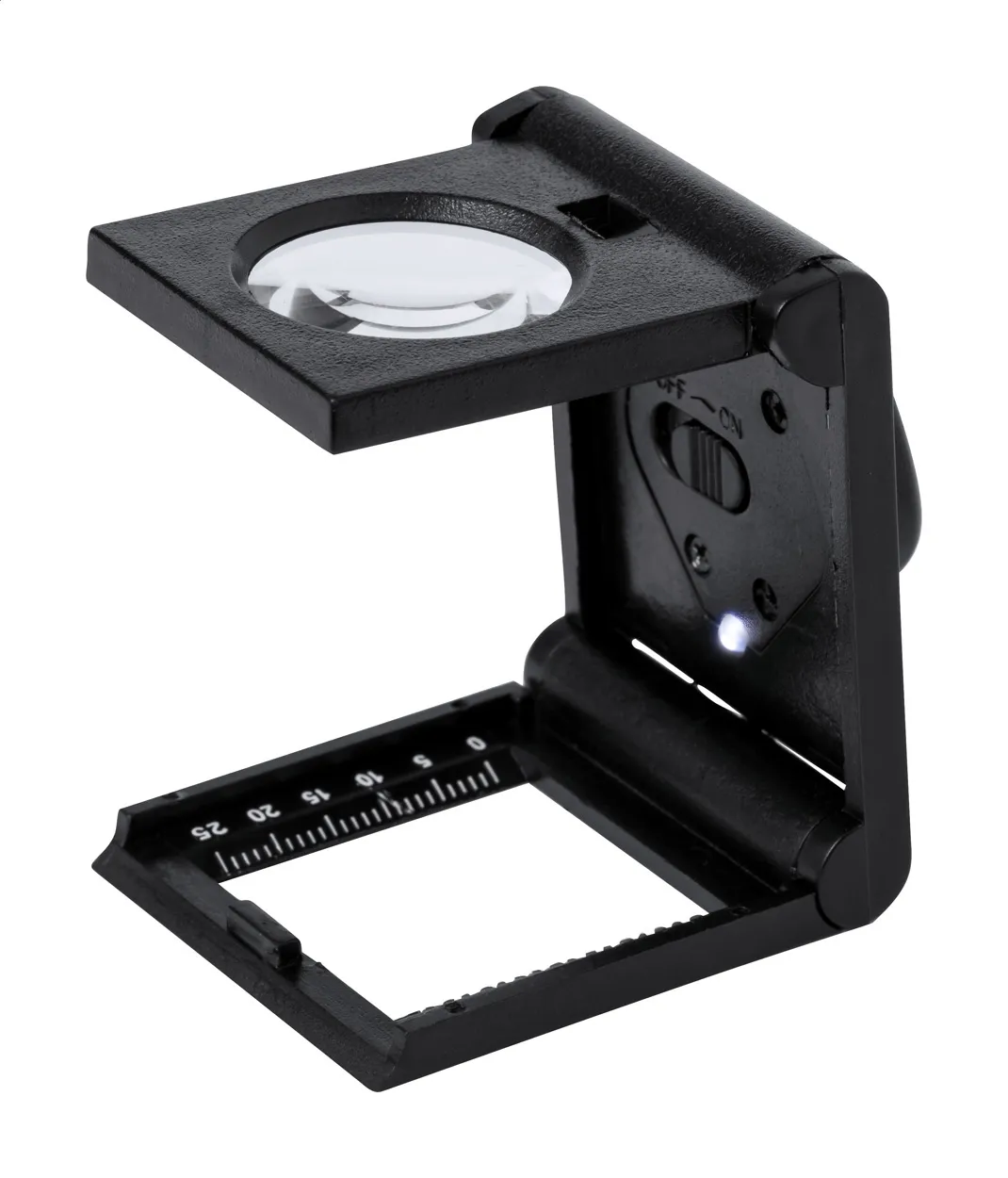 Foldable magnifier in PP plastic with 1 LED and ruler. Including button cell batteries.