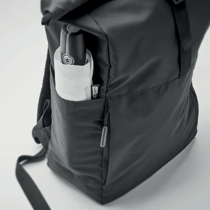 €15.3915 inch rolltop laptop backpack in 300D RPET polyester. Large zippered front pocket, hidden side pocket with small carabineer loop inside. The carabiner is not for climbing (non professional use).
