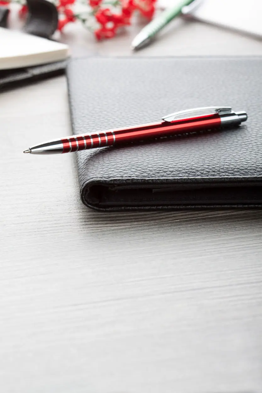 Aluminium ballpoint pen with rings, with chrome clip and tip. With blue refill.