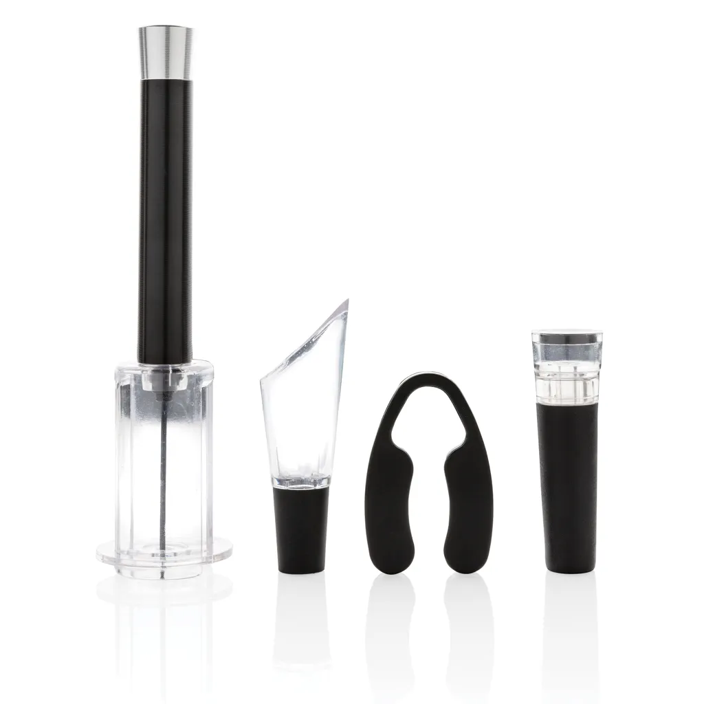 Have everything you need to open, serve and store your favourite wines with this 4 pcs wine set. The set consists of an air pump wine opener, foil cutter, wine stopper with vacuum pump & wine pourer with aerator. Packed in a luxury gift tube.