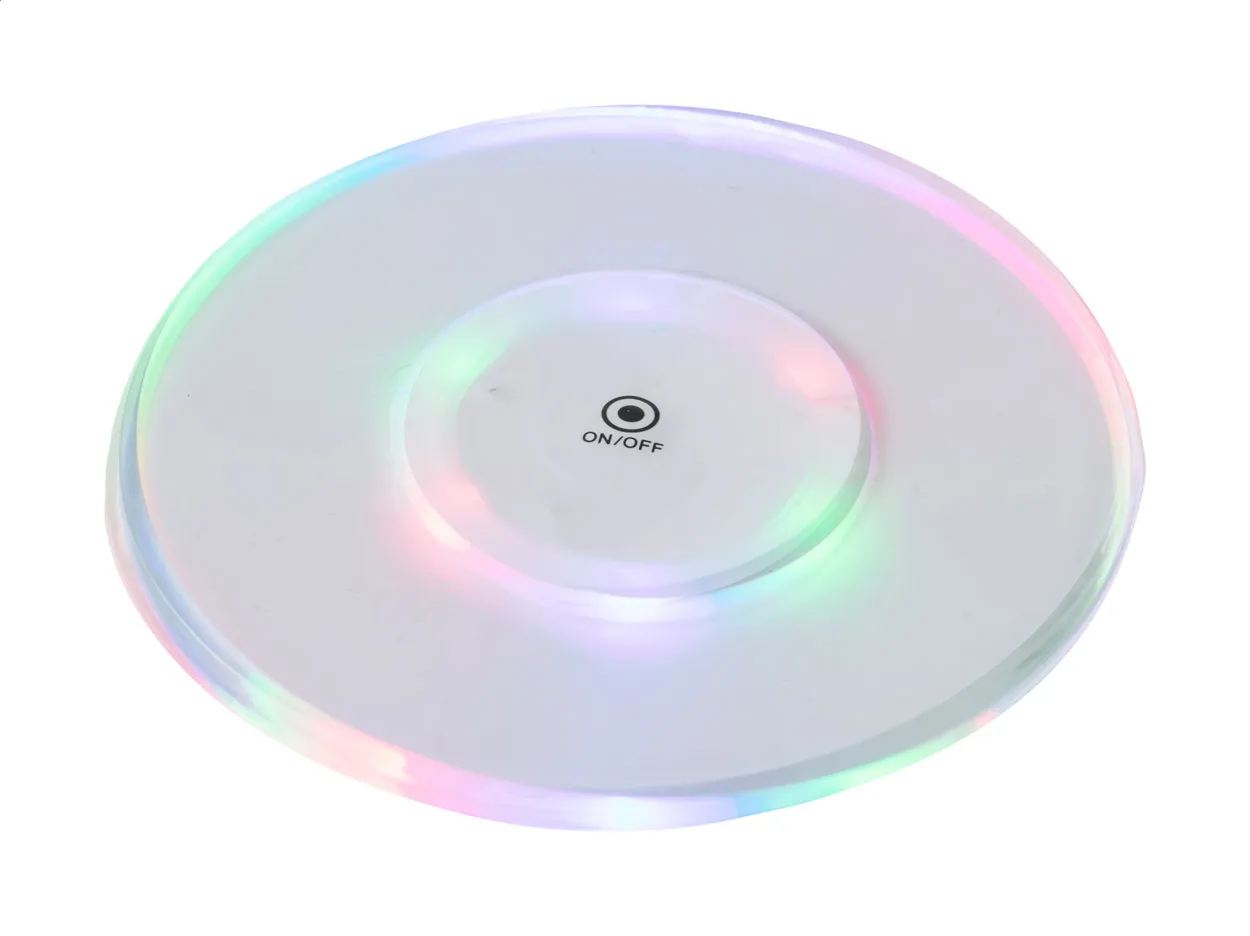 Acrylic coaster with 6 multicolour LED lights and 3 light modes. Including button cell batteries.