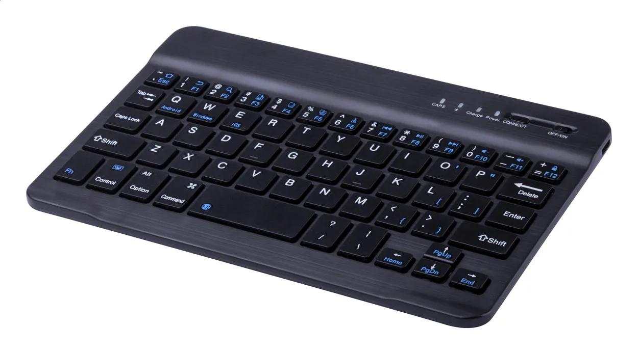 Multi-device bluetooth keyboard with international QWERTY layout. With rechargeable battery.