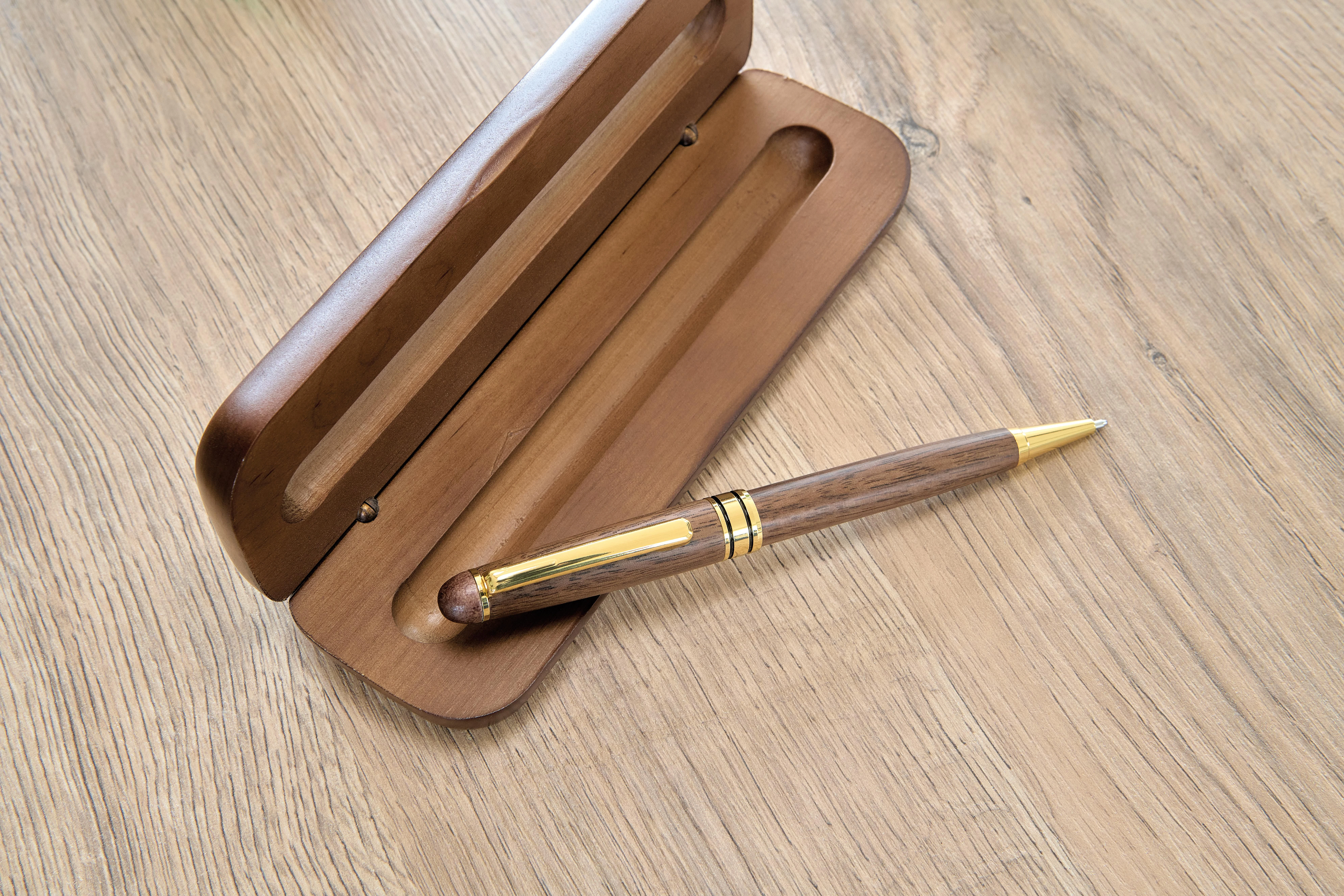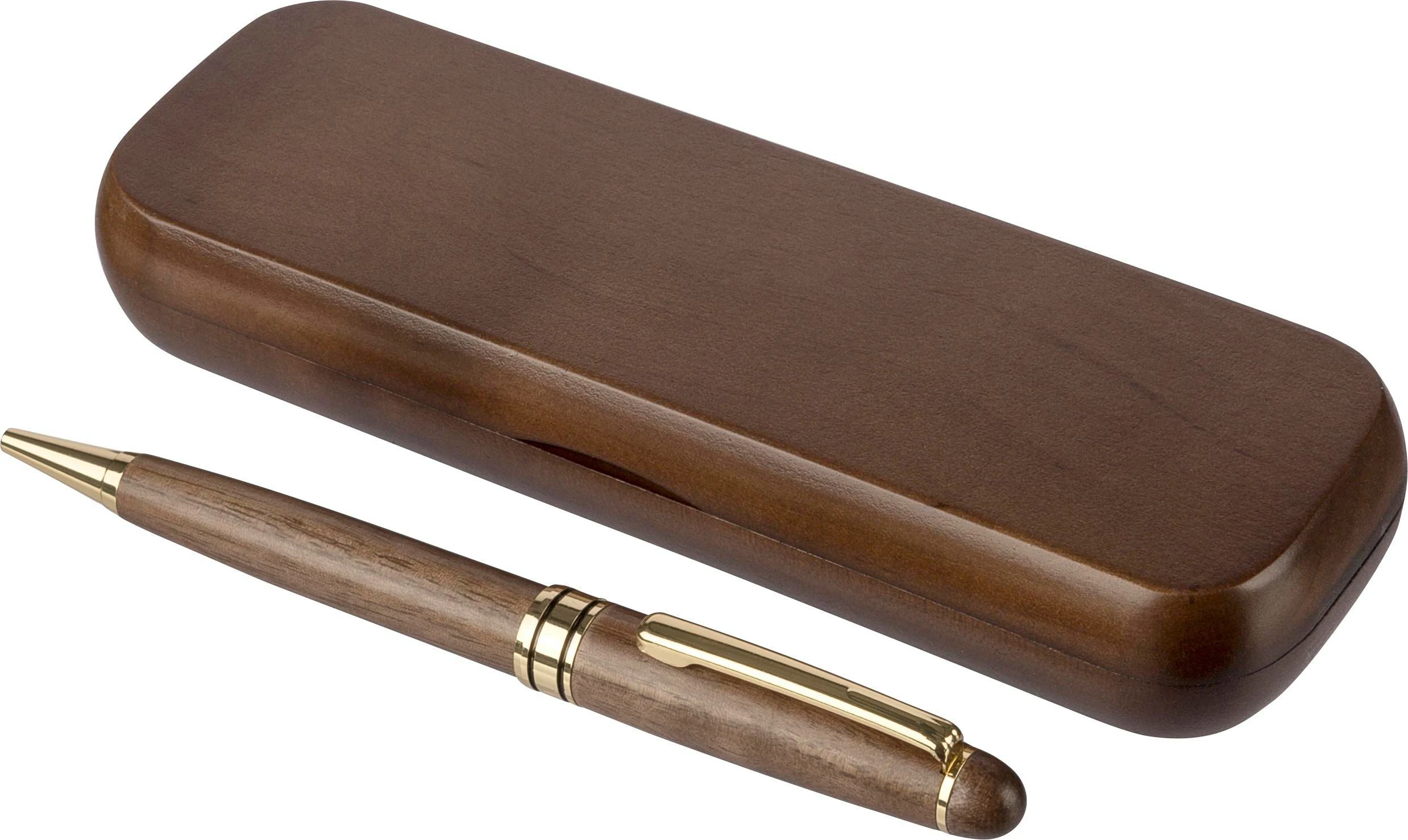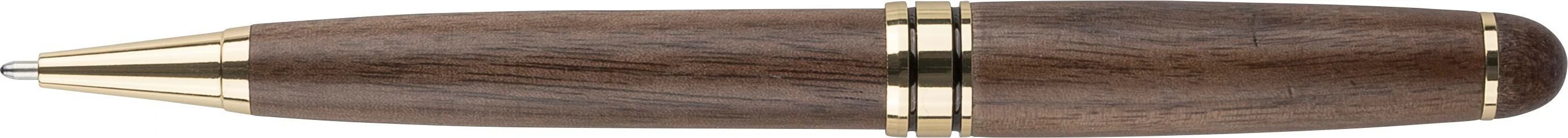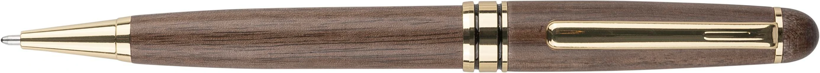 €10.10Walnut wooden and brass twist ballpen with metal tip, clip and trim. Fitted with German Dokumental ink in blue writing and an approximate writing length of 1,000 meters. Packaged in a maple wooden box and a brown cardboard box. Blue ink.