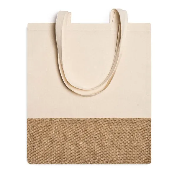 Eco shopping bag made of 120 gsm cotton and jute in natural colour, with a section of jute on the lower part of one side of the bag and 70 cm long handles.