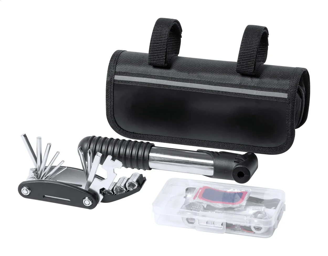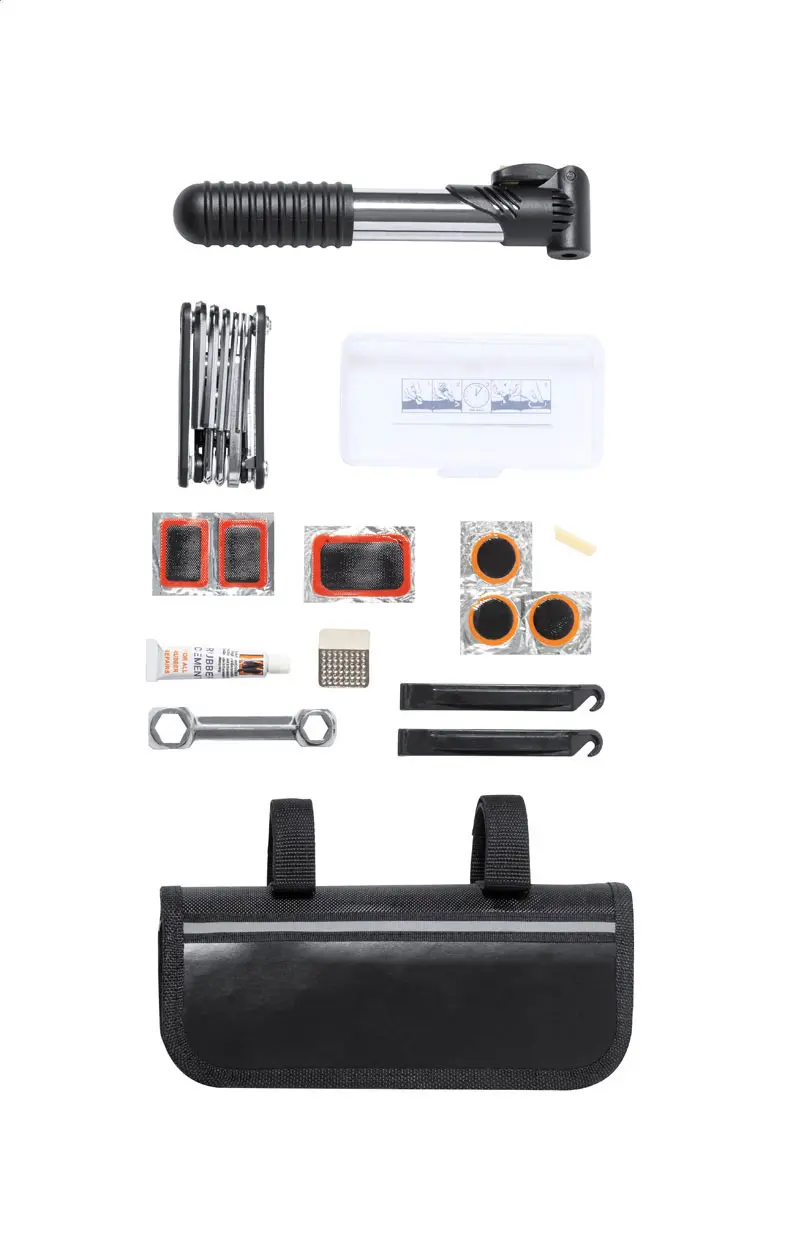 €20.35Bicycle repair kit in practical bike frame bag. Including: 15 functions multi tool, hexagon wrench, mini pump and puncture repair kit (2 tyre levers, grater and 6 patches). 600D polyester.