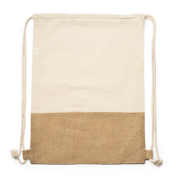 €0.93Eco drawstring backpack made of 120 gsm cotton and jute in natural colour, with a section of jute on the lower part of the front side. Drawcords sewn to both lower corners.