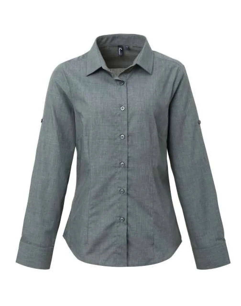 Fabric 65% Polyester, 35% Cotton Poplin 105gsm Features Soft collar styling Cross-dye textured fabric appearance Roll-up sleeve option with button fastening on the upper arm Bust and back darts Curved hem