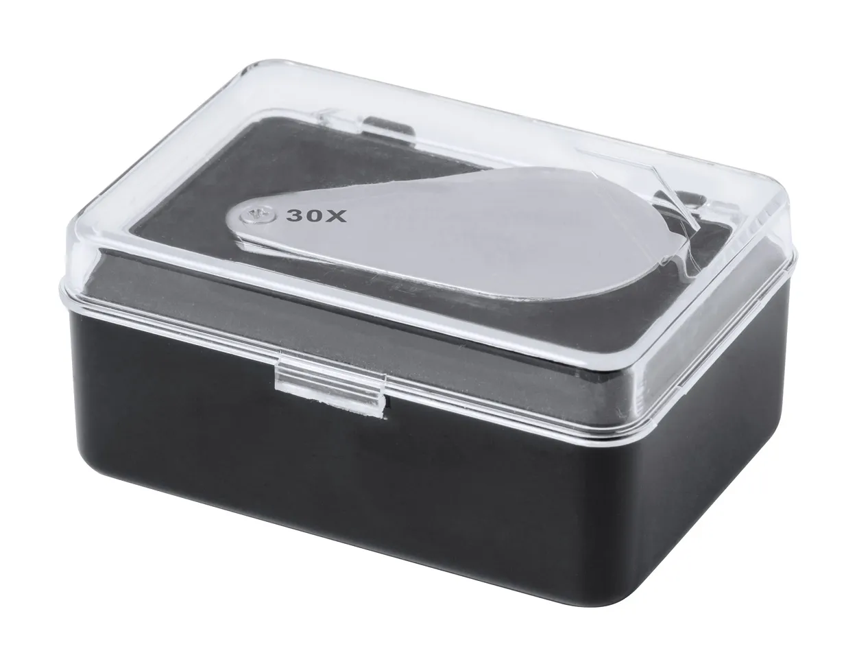 Foldable magnifier in ABS plastic and metal, with 2 LEDs. Including button cell batteries.