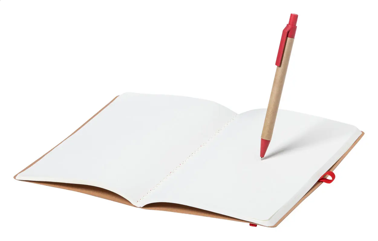 Bilježnica s korice od recikliranog kartona s 60 praznih listova i obojanom gumiranom trakom, veličine A5. Uključuje kemijsku olovku od plastike od pšenične slame s plavim punjenjem.