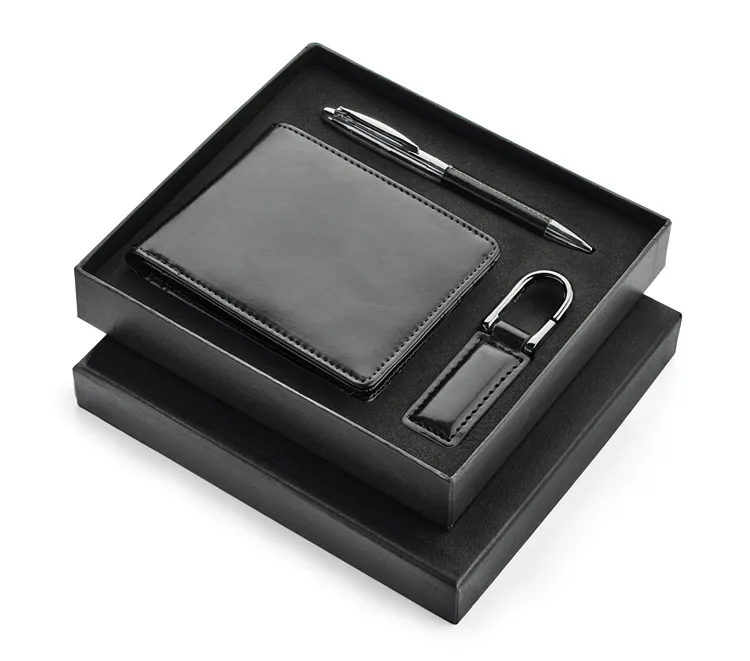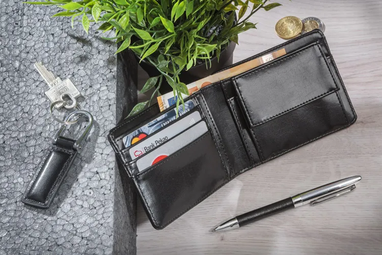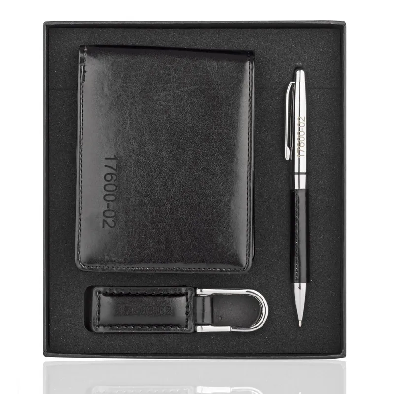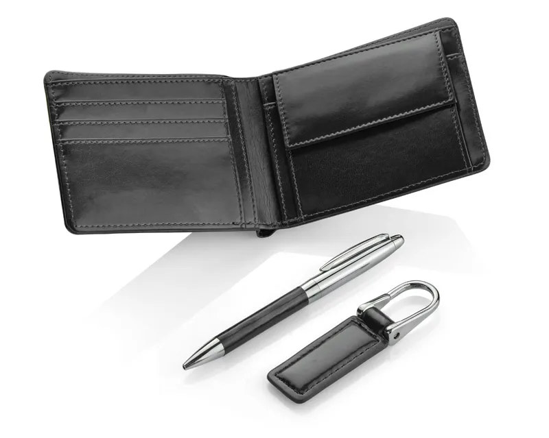€30.29Poklon set sastoji se od novčanika, privjeska za ključeve i metalne kemijske olovke. Novčanik je izrađen od eko-kože i sadrži 2 pretinca za novčanice, džep za kovanice i dodatne džepove za primjerice, kreditne kartice ili račune. Svi elementi su pakirani u elegantnu crnu kutiju. Logo se može gravirati na svaki element zasebno, kao i na kutiju. Dimenzije proizvoda: 115 x 91 x 15 mm (novčanik), 133 x ⌀10 mm (olovka), 65 x 25 x 5 mm (privjesak za ključeve), 181 x 163 x 31 mm (pakiranje).