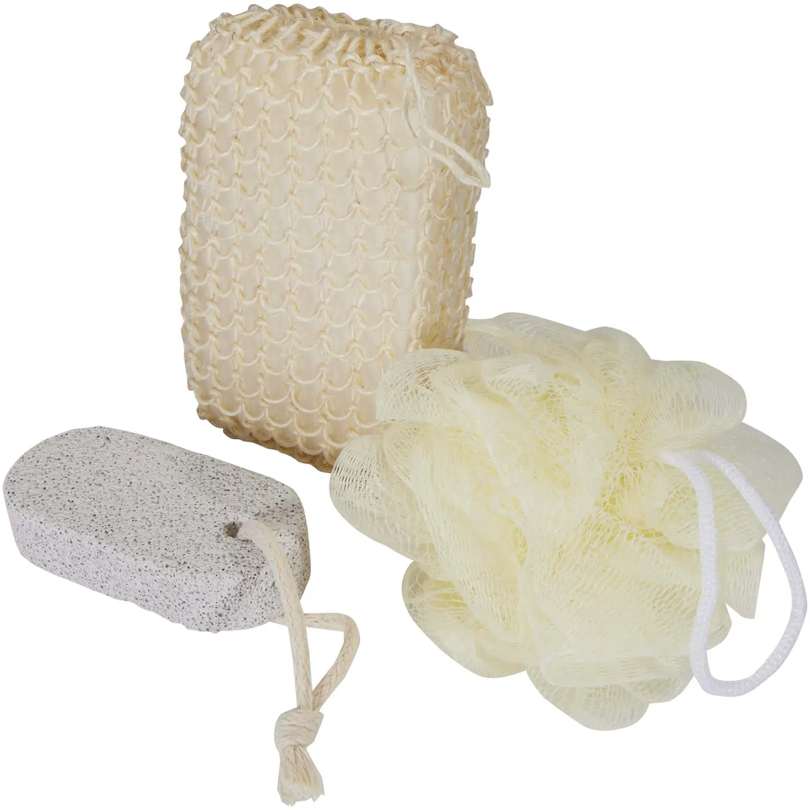 €3.23Set od 3 kupaonska dodatka: kuglica/lufa za kupanje (9 cm), kamen za pete (9,5 x 4,5 x 1,5 cm) i spužva od konoplje (14 x 8 x 5 cm), pakirano u poliesterskoj vrećici