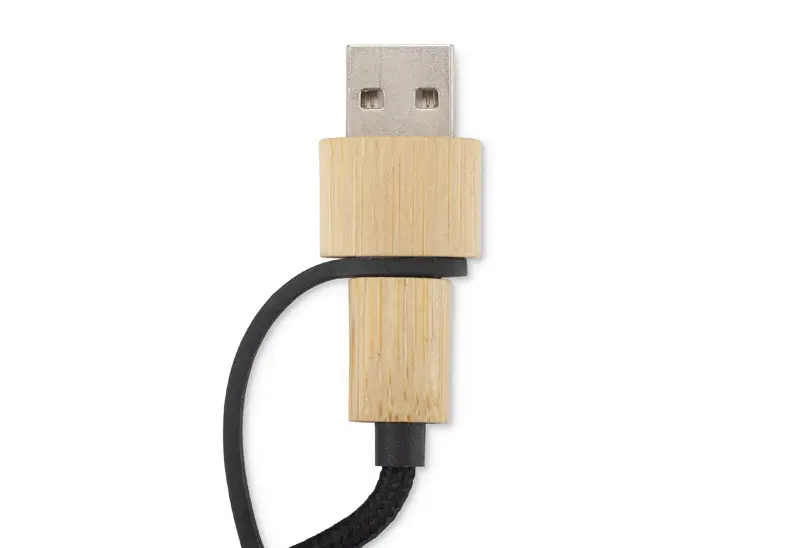 Equipped with four connectors: USB-A, 2x USB-C, micro USB and Lightning, and allows you to charge various devices with up to 15W (5V/3A). The cable is covered with a durable braided sleeve, and a round piece with a bamboo finish hides the branding panel - once engraved, the logo is illuminated with a white LED light.