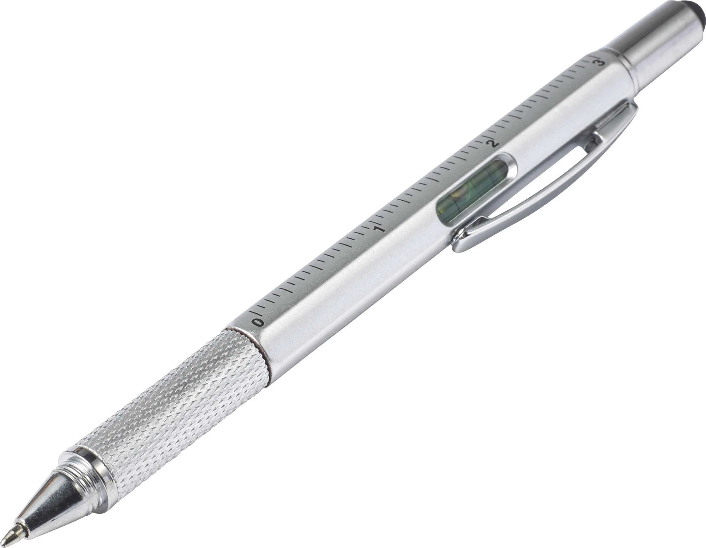 Višenamjenska kemijska olovka od ABS-a s mehanizmom na okretanje, sadrži libelu, ravnalo i gumeni vrh za kapacitivne ekrane, odvrtanjem gumenog vrha otkriva se skriveni odvijač, crna tinta