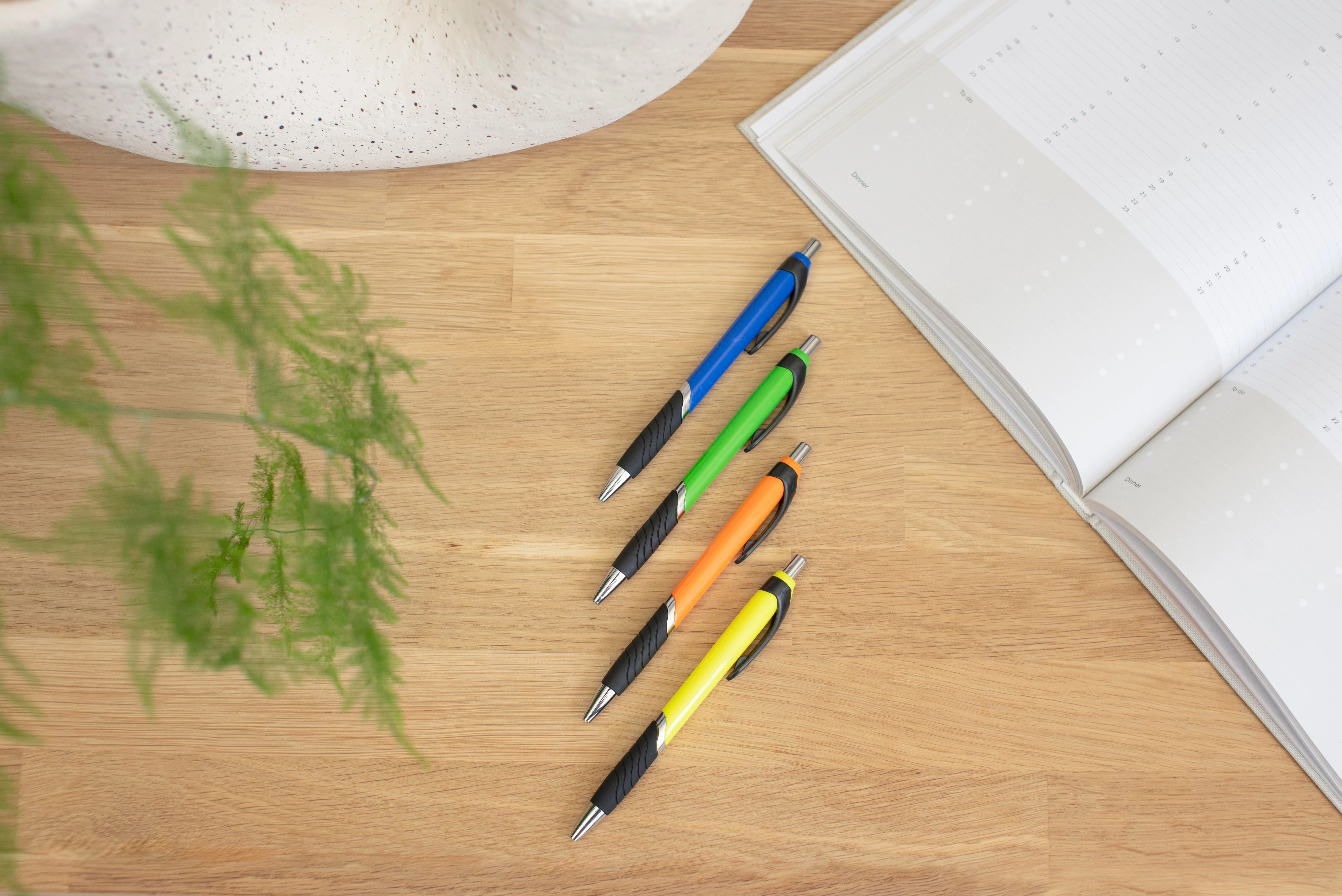 ABS ballpen with rubber grip. Blue ink.