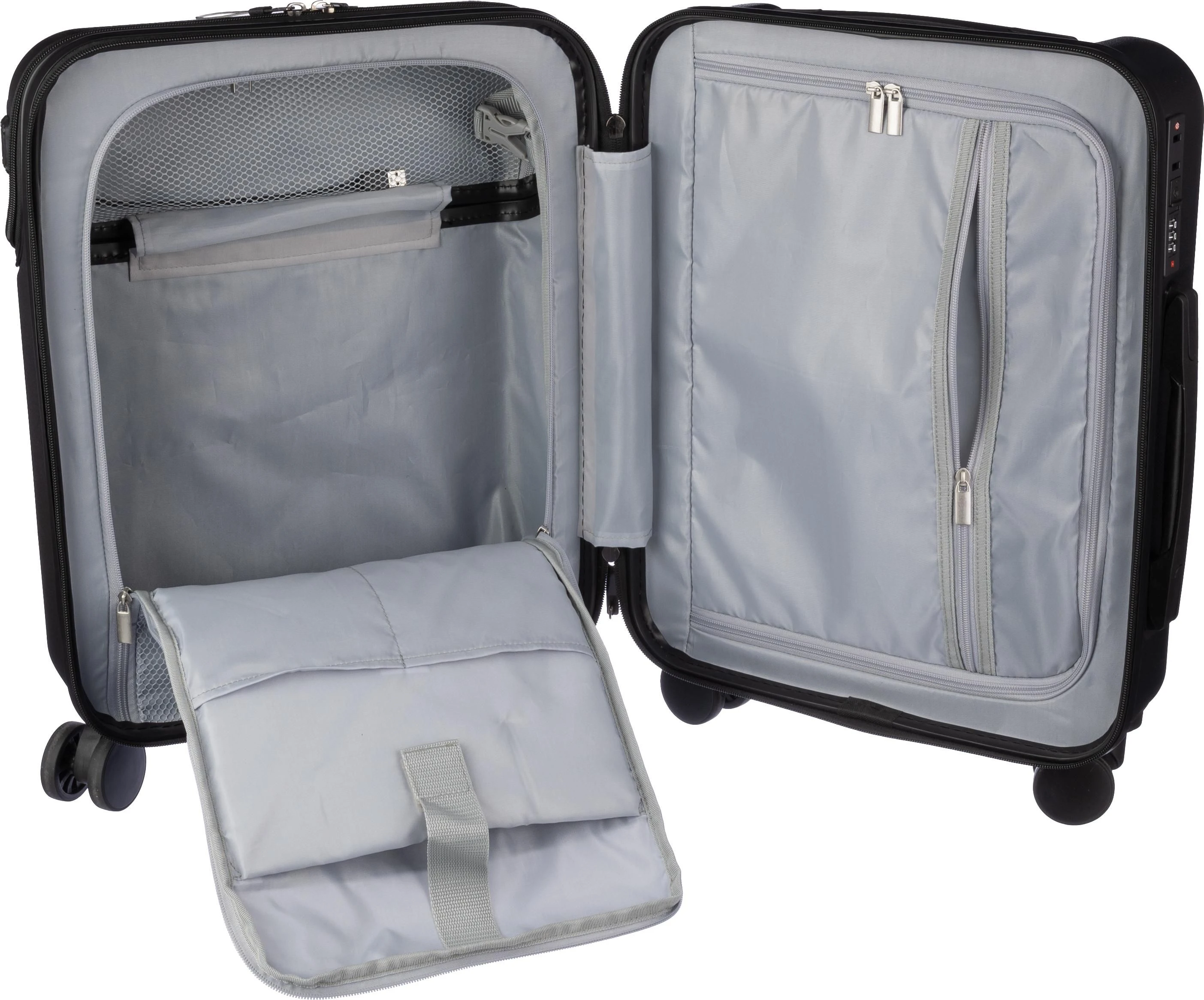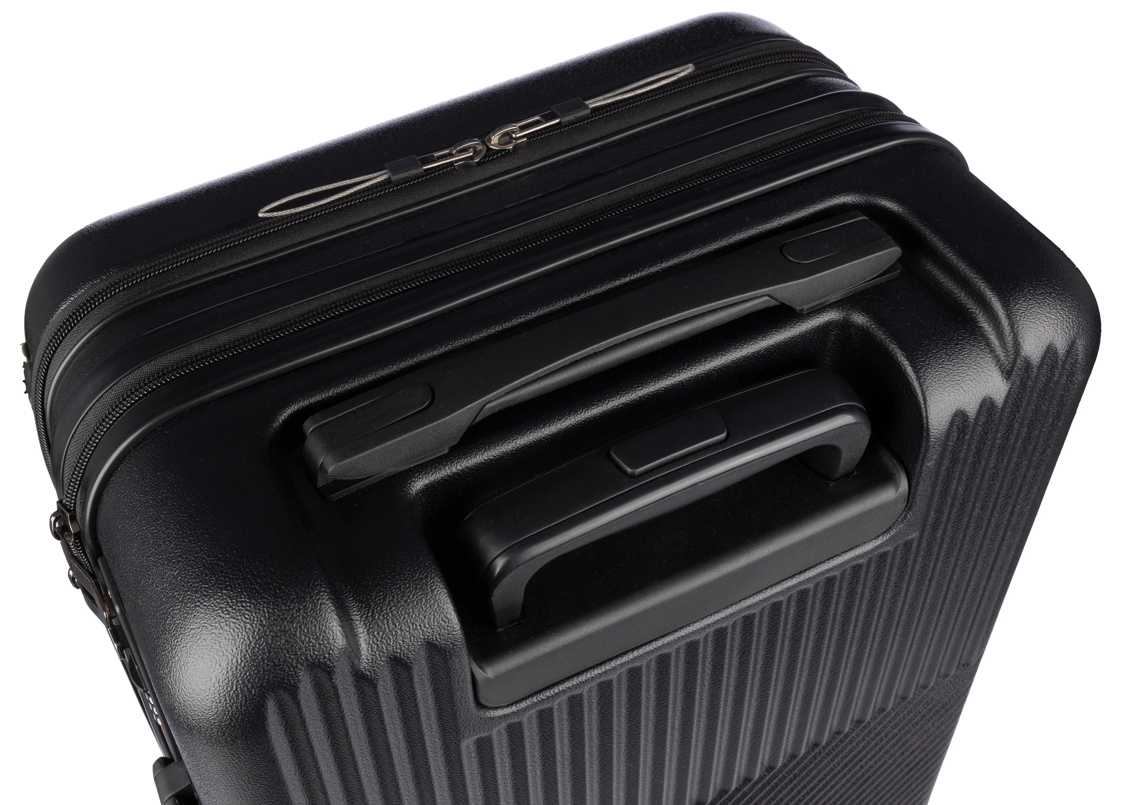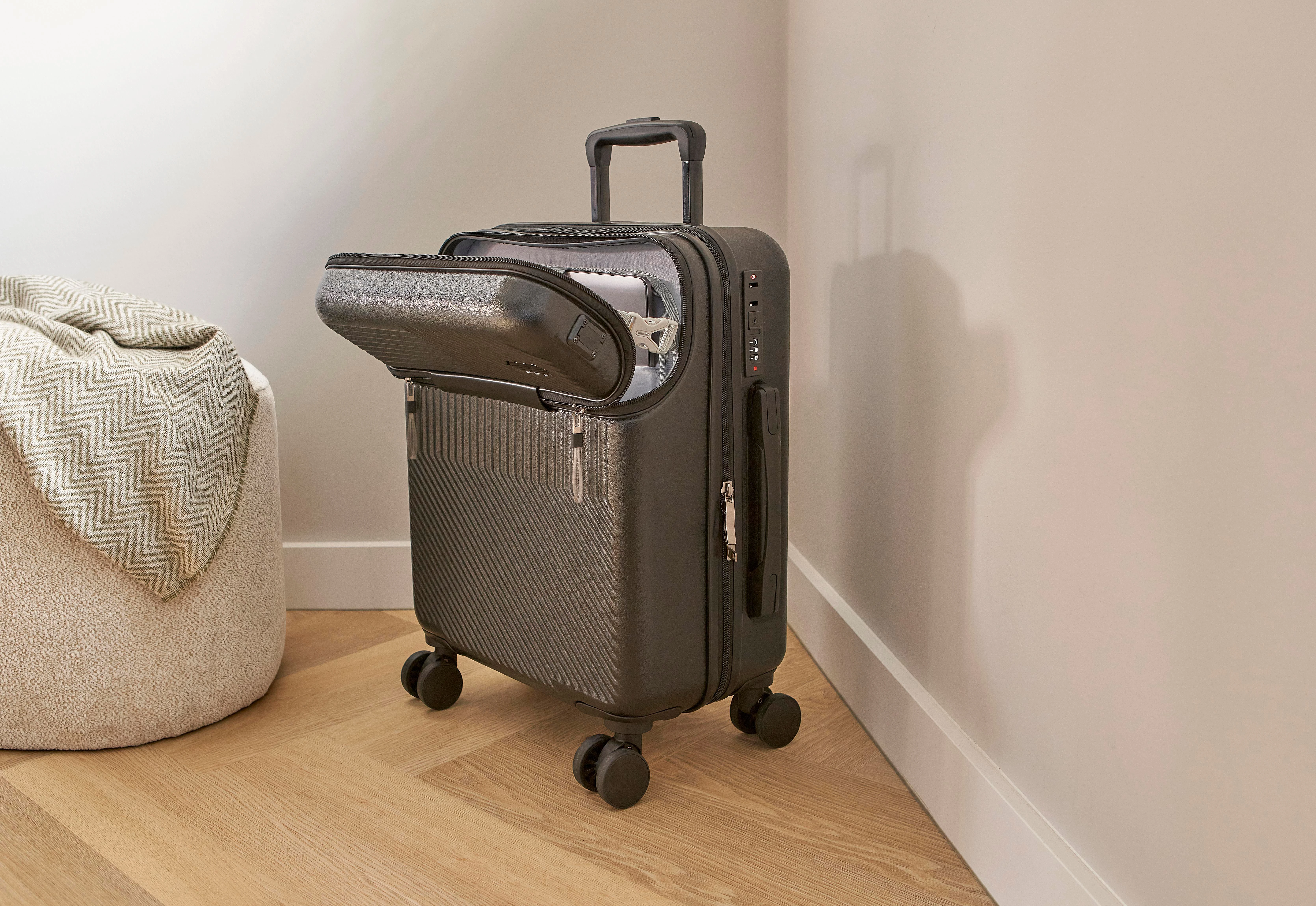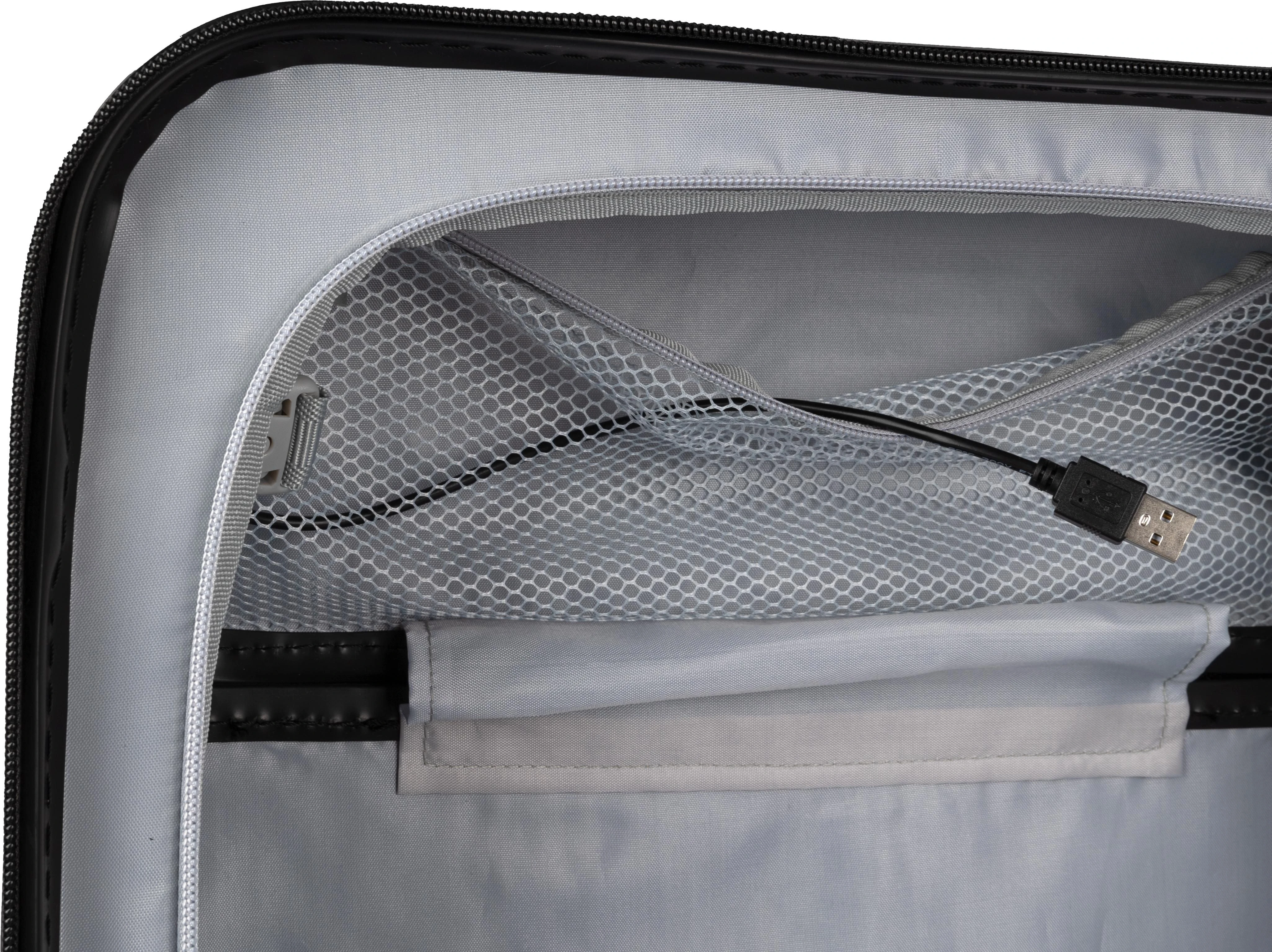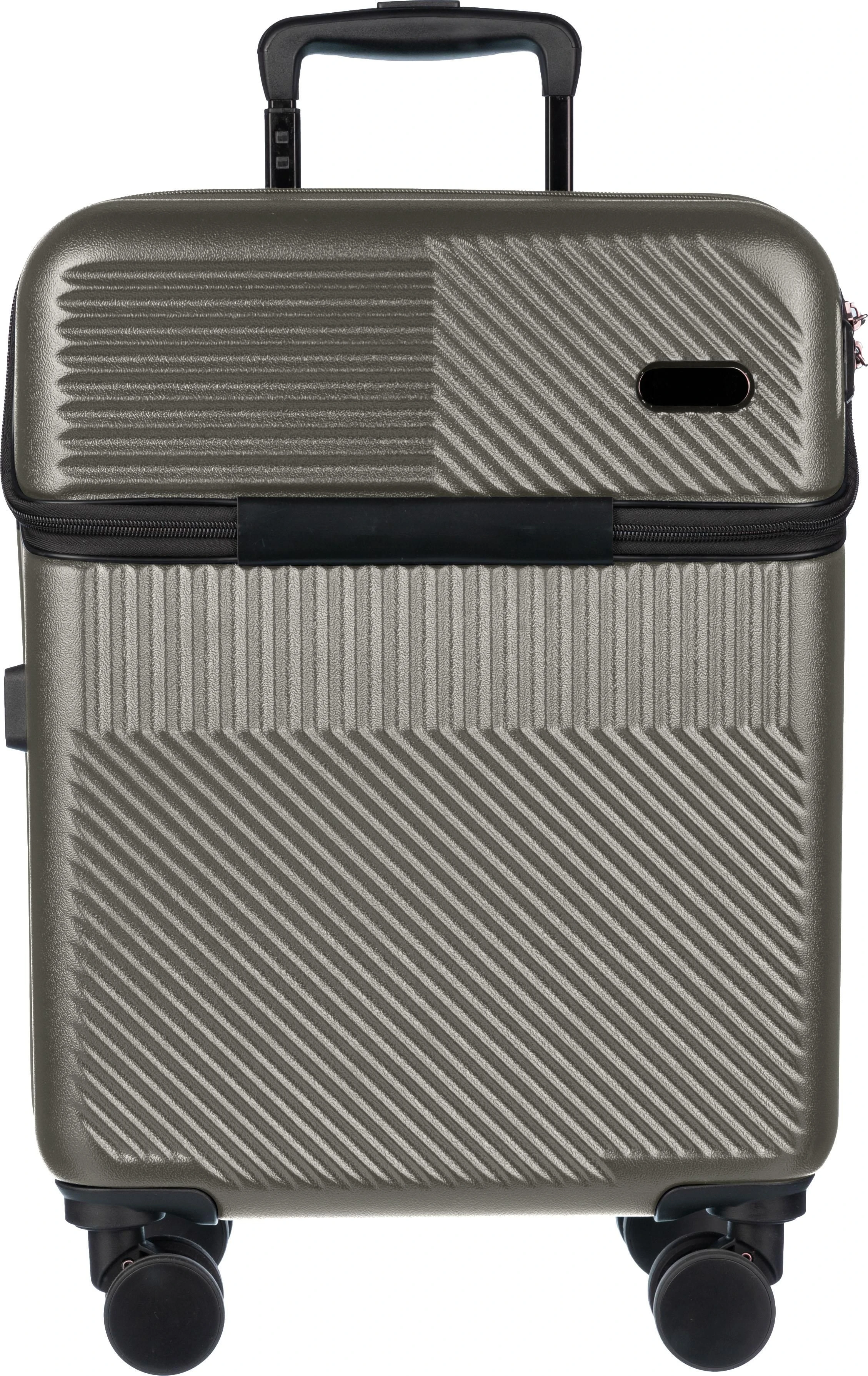 €113.19ABS kofer na kotačima (20 inča) s prednjim džepom na patentni zatvarač za laptop, 8 kotača i sustavom ručke na tri razine. Uključuje brojčanu bravu i odvojenu ploču za lasersko graviranje. S USB priključkom.